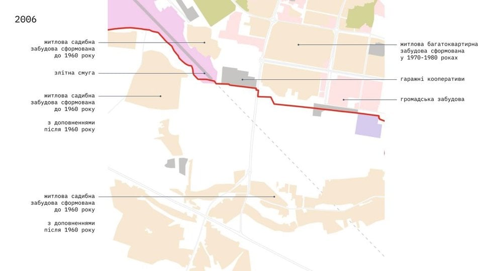 Він додав, що житлові квартали зі сторони Львова були запроєктовані ще в радянському генплані. Коричневим кольором позначена нова забудова, яка з’явилася за останні 20 років.