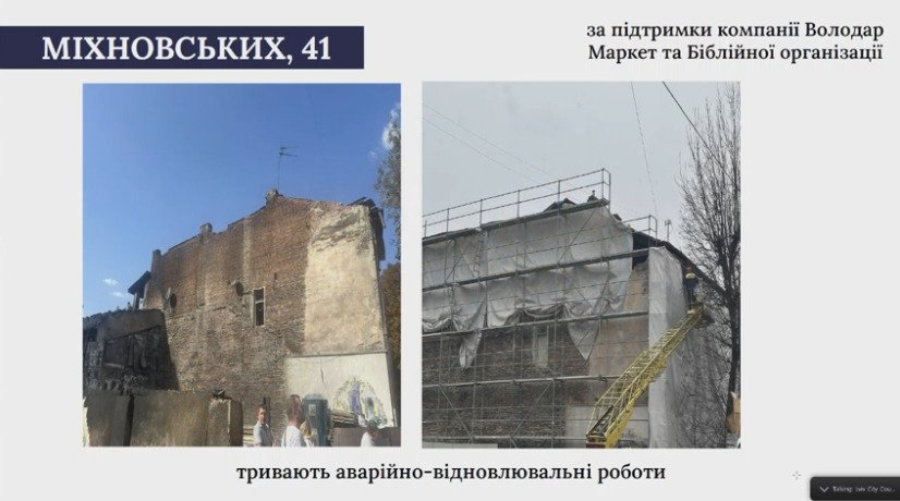 «Тут була дуже складна ситуація, оскільки потрібно було вимурувати стіну, бо була зруйнована окрема квартира. Складний випадок був і на вул. Міхновських, 41. Там тривають аварійно-відновлювальні роботи, але головна частина робіт уже завершена. Очікуємо, завершення впродовж місяця», – розповів Андрій Москаленко.