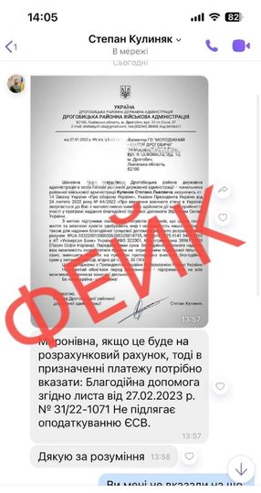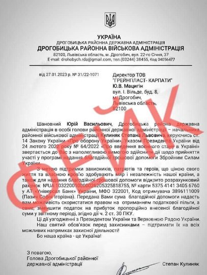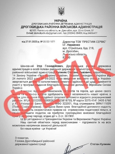 Одночасно шахраї надсилають ще й фейкові листи нібито від Дрогобицької РВА.