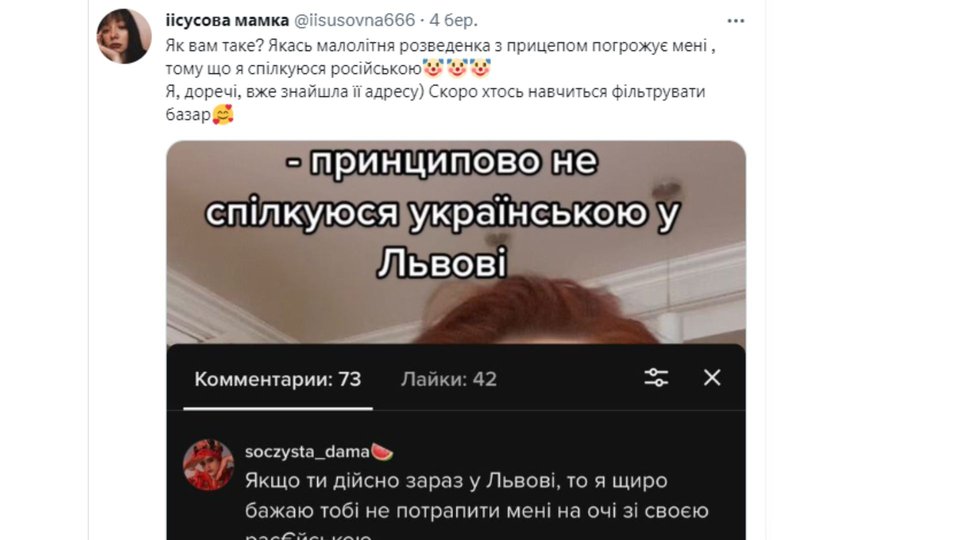 «Мій тато військовий. Він знає про цю ситуацію. Він не зрозумів, в чому проблема. Я сказала, що проти фемінізму, бо це зараз це ні*рена не фемінізм, бо це презумпція вини чоловіків. Ті, хто скаржився, навіть не ходять в цей заклад. Одна з Львівської області. Інша, як я її називаю, рижа мавпа, яку троха перекосило. Я взагалі не знаю, звідки вона. Інші, хто коментував це відео, це фанатки цих двох. Це історія не про мій хейт і ненависть до когось. Вважаю, що сучасні феміністки гірші за русню. Це факт і цього не зміниш», – обурюється дівчина.