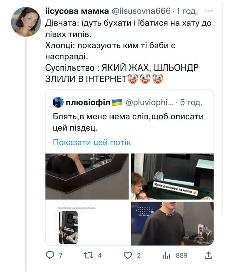 «Той треш, що там творився, коли зливали переписки й домовлялися, що хлопці їм куплять. Це все є в інтернеті. Коли поліціянти дзвонили й питали, чи будуть вони писати заяву, то дівчата реготали в трубку й казали, що ще раз прийдуть, якщо їх покличуть. Я написала твіт, чого ми взагалі очікуємо, коли сходяться два абсолютно й*бнуті світи. Ґвалтувати, як і ображати, нікого не можна. Резонанс висмоктали з пальця. Чого цього не висвітлювали раніше?», – говорить дівчина.