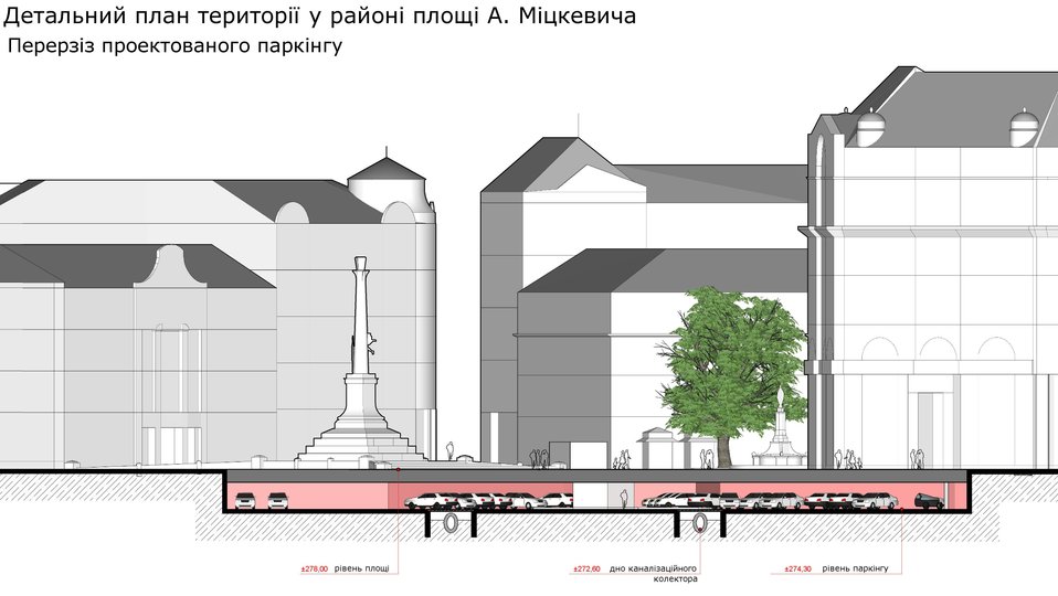 Згідно з ДПТ, що охоплює площу 1,66 га, під пам’ятником Адаму Міцкевичу в центрі Львова збудують однорівневий підземний паркінг на 40 місць. Заїзди та виїзди з паркінгу облаштують із обох сторін пам’ятника Міцкевичу. Крім цього, сміттєві контейнери, що зараз розташовані на площі, замінять на підземні.