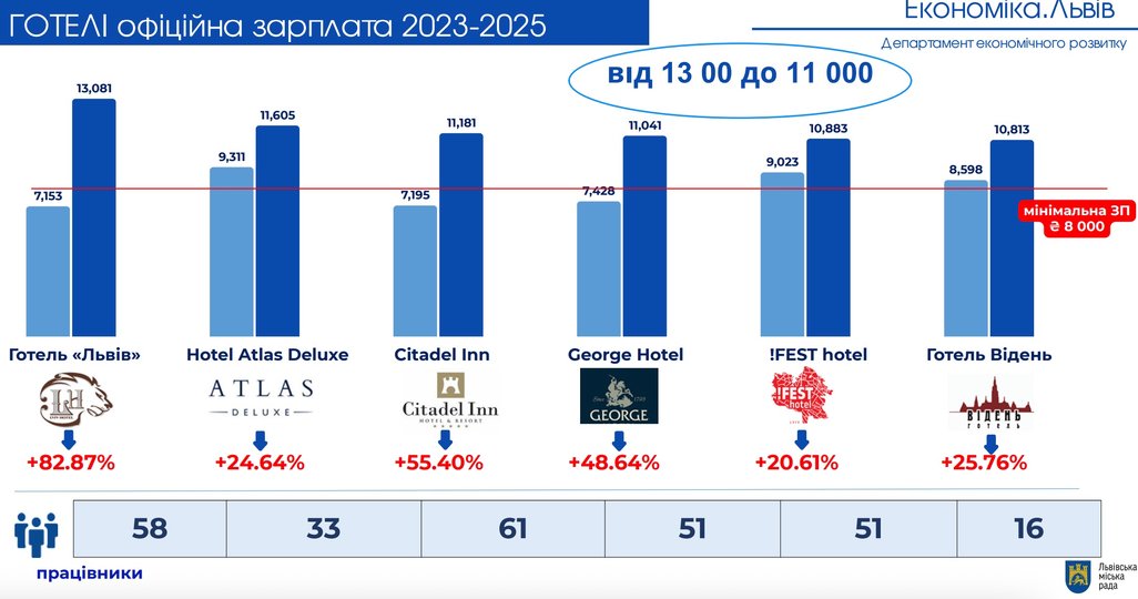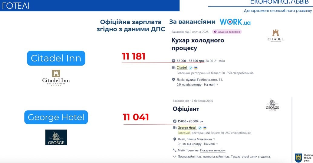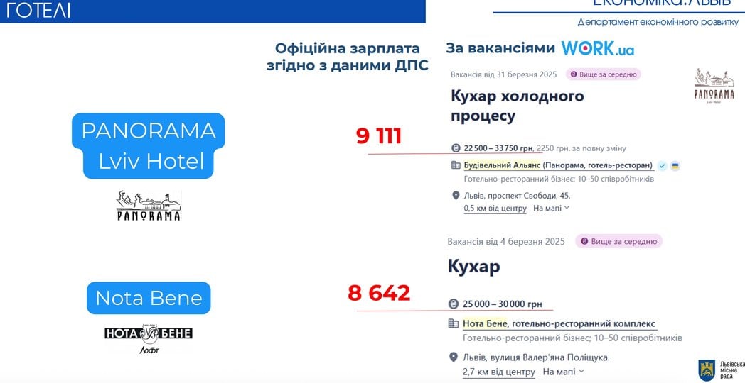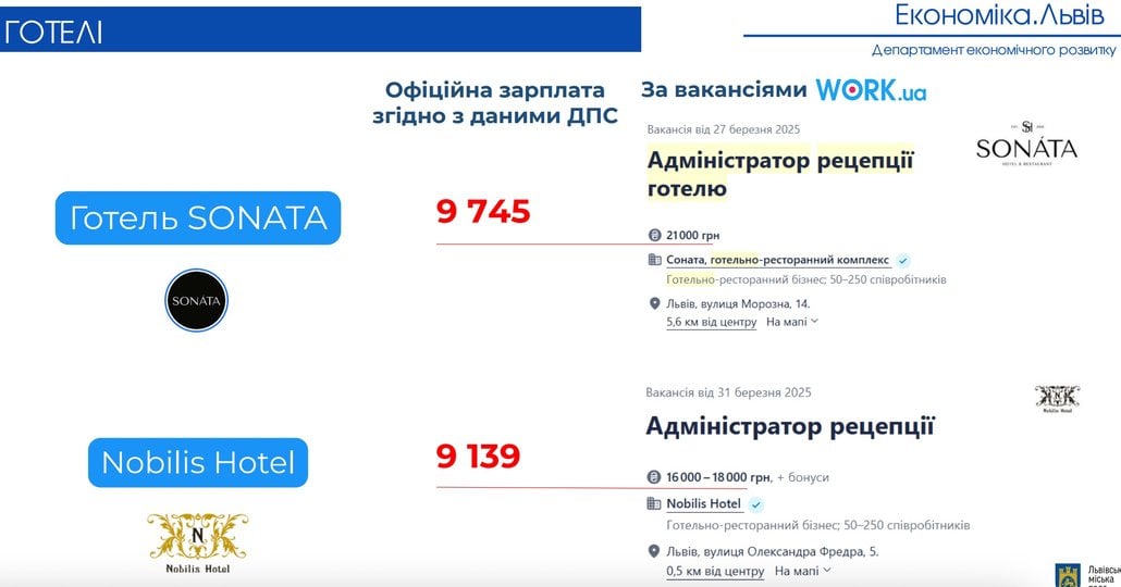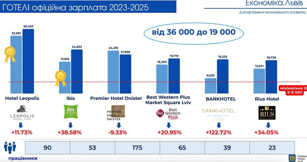 Загалом ЛМР проаналізувала діяльність 26 найбільших готелів міста. Середня офіційна зарплата становить 24 тис. грн. Найвищі середні зарплати зафіксували в готелях: