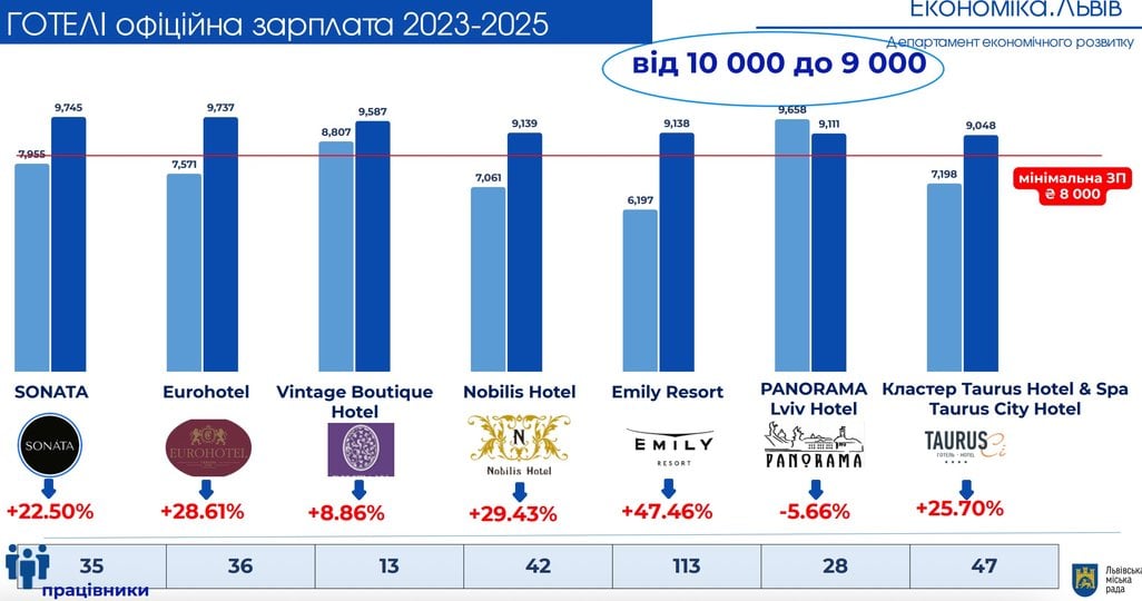 Львівська міська рада проаналізувала рівень зарплат у найбільших готелях Львова. За результатами аналізу зʼясувалося, що у 2024 році низка елітних готелів платили працівникам зарплату нижчу мінімальної ставки, тобто менше 8000 грн. Про це під час засідання виконавчого комітету у вівторок, 15 квітня, повідомила директорка департаменту економічного розвитку Інна Свистун.