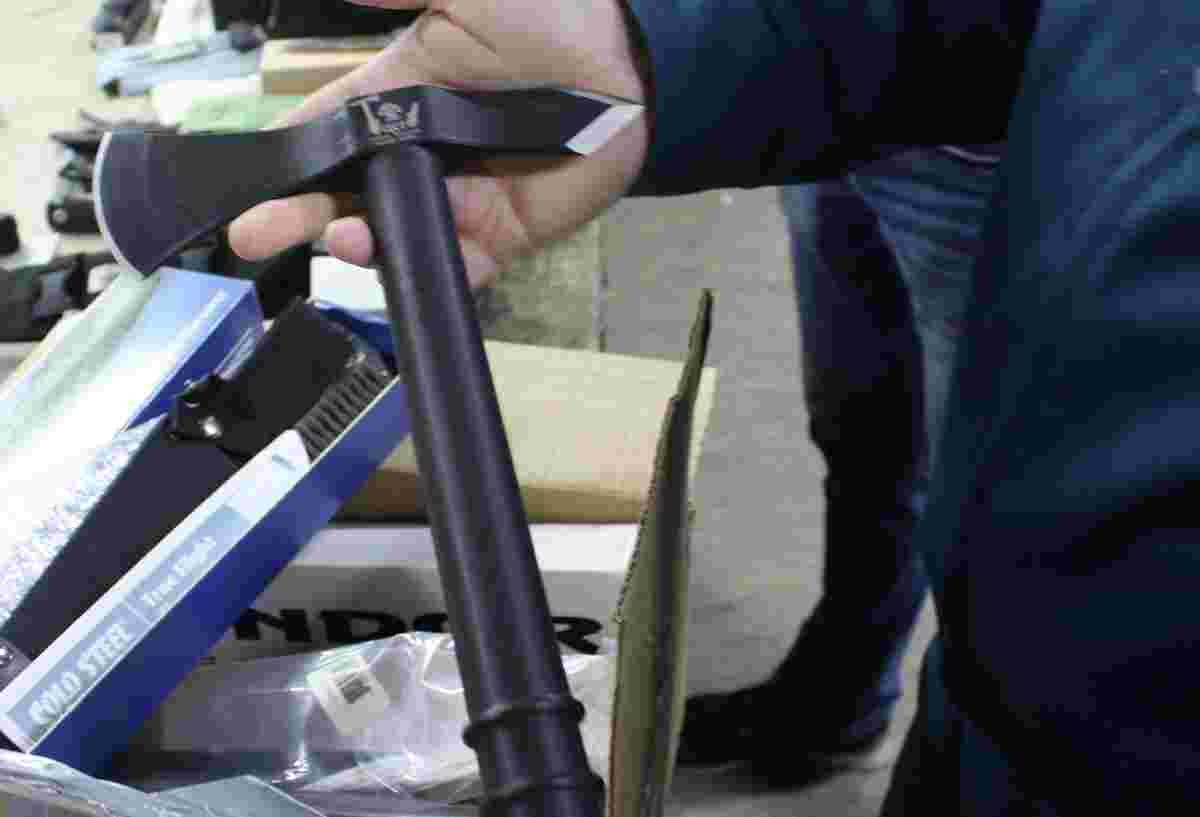 Працівники Галицької митниці виявили у закордонній посилці арсенал холодної зброї. У відправленні, що надійшло зі США і було адресоване у Херсонську область, пересилали 25 ножів у піхвах та дві сокири Tomahawk.