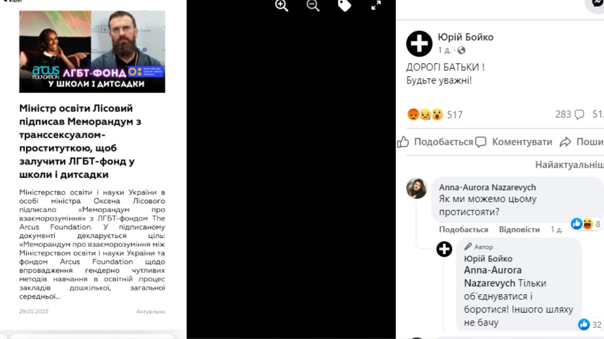 У своєму дописі на Facebook Юрій Бойко переконує, що копію документа йому передав працівник міністерства, його прізвища священик не розголошує. Юрій Бойко поширює скріншот публікації із сайту «Всі разом» із заголовком «Міністр освіти Лісовий підписав Меморандум з транссексуалом-проституткою, щоб залучити ЛГБТ-фонд у школи і дитсадки».