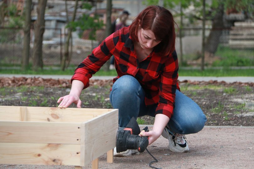 Галина з Токмака Запорізької області – одна з перших мешканок, яка прийшла допомогти активістам облаштовувати грядки. Їй доручили покривати конструкції для грядок олією, щоб зміцнити деревину. У модульному містечку жінка з доньками й онуками живе з квітня 2022 року.