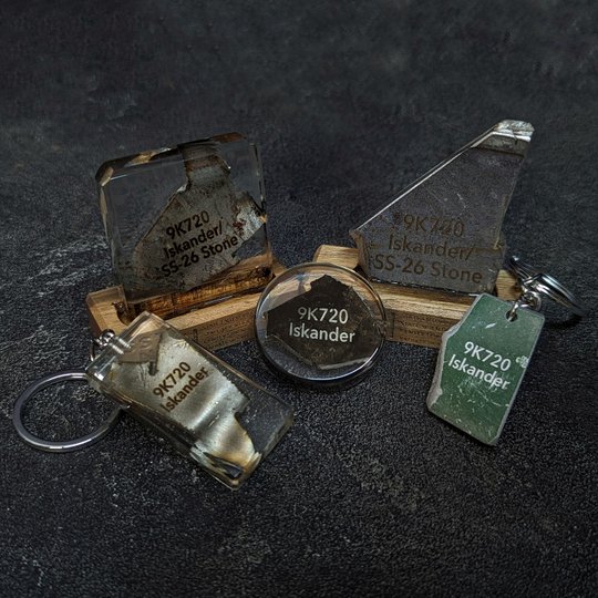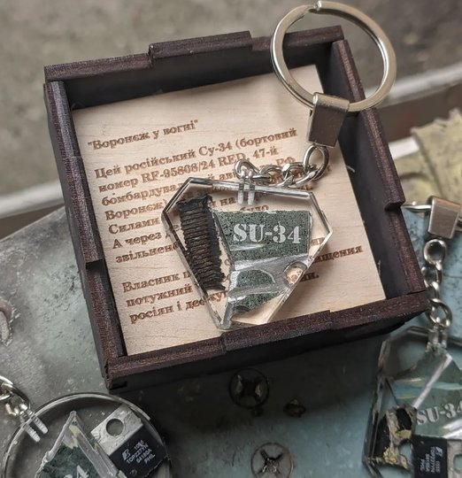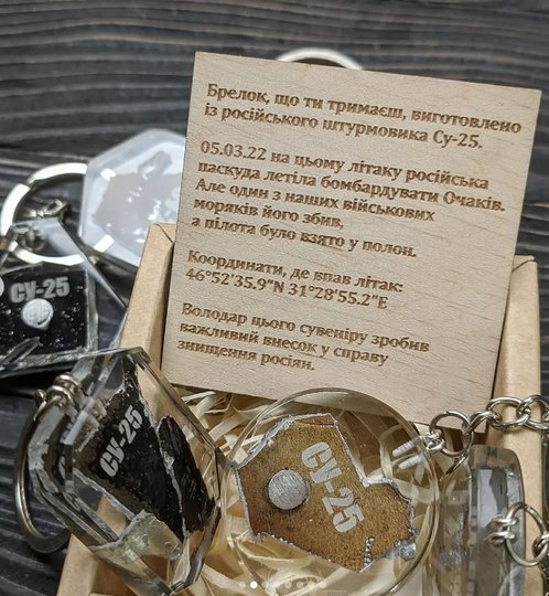 «Мене знайшов військовий кореспондент, волонтер Петро Шуклінов. Точніше його друг приїхав до Львова, показав мені шматки ЗРК "Оса", там були якісь фари. Він попросив зробити з них брелоки. У мене тоді було мало інструментів, я шматками це все розламав, залив смолою. Воно й мало виглядати таким розбитим, а не красивим з візерунками. Дохла русня такою і буде», – каже Сергій Науменко.