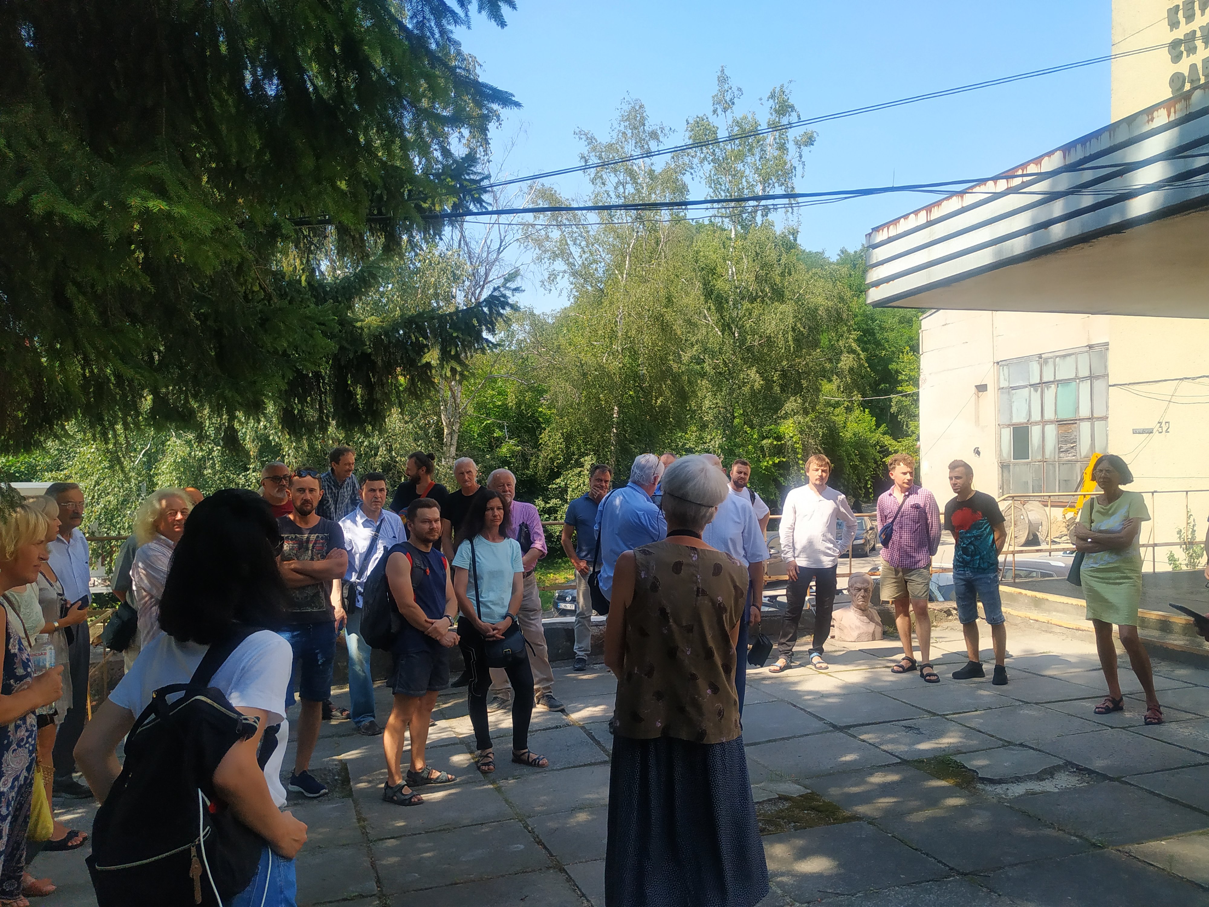 Перед скульптурною фабрикою 19 серпня зібралися художники, галеристи, куратори. Всі вони попри вихідний та спеку прийшли на воркшоп, який зініціювала мерія. Перед обговоренням і дискусією всіх охочих запросили на екскурсію територією. Її провела львівська керамістка Анна Лисик. Мисткиня розповідає, що прийшла працювати на фабрику 1988 року. Жінка каже, що застала добрі для підприємства часи. Після цього почався стрімкий занепад.