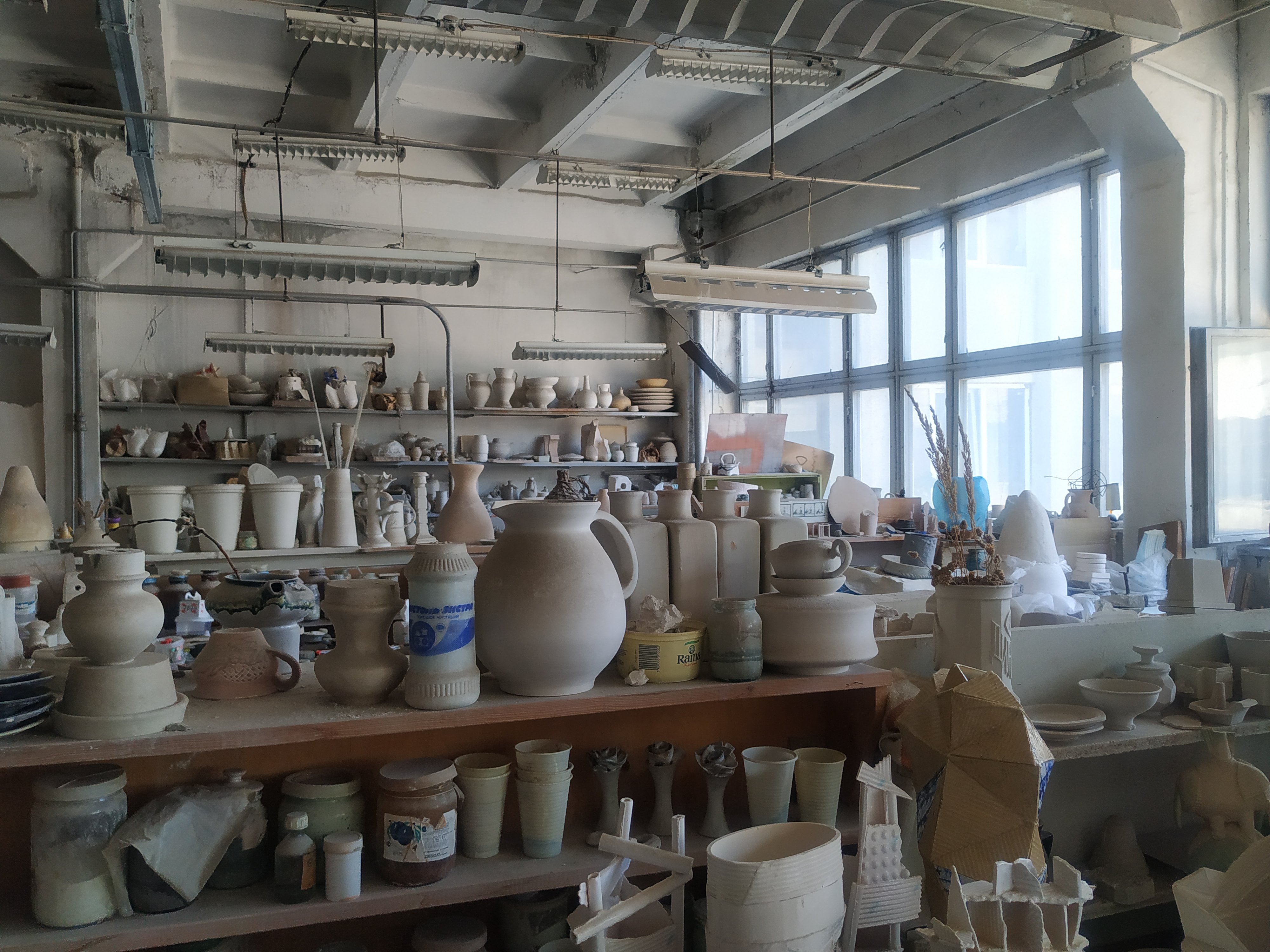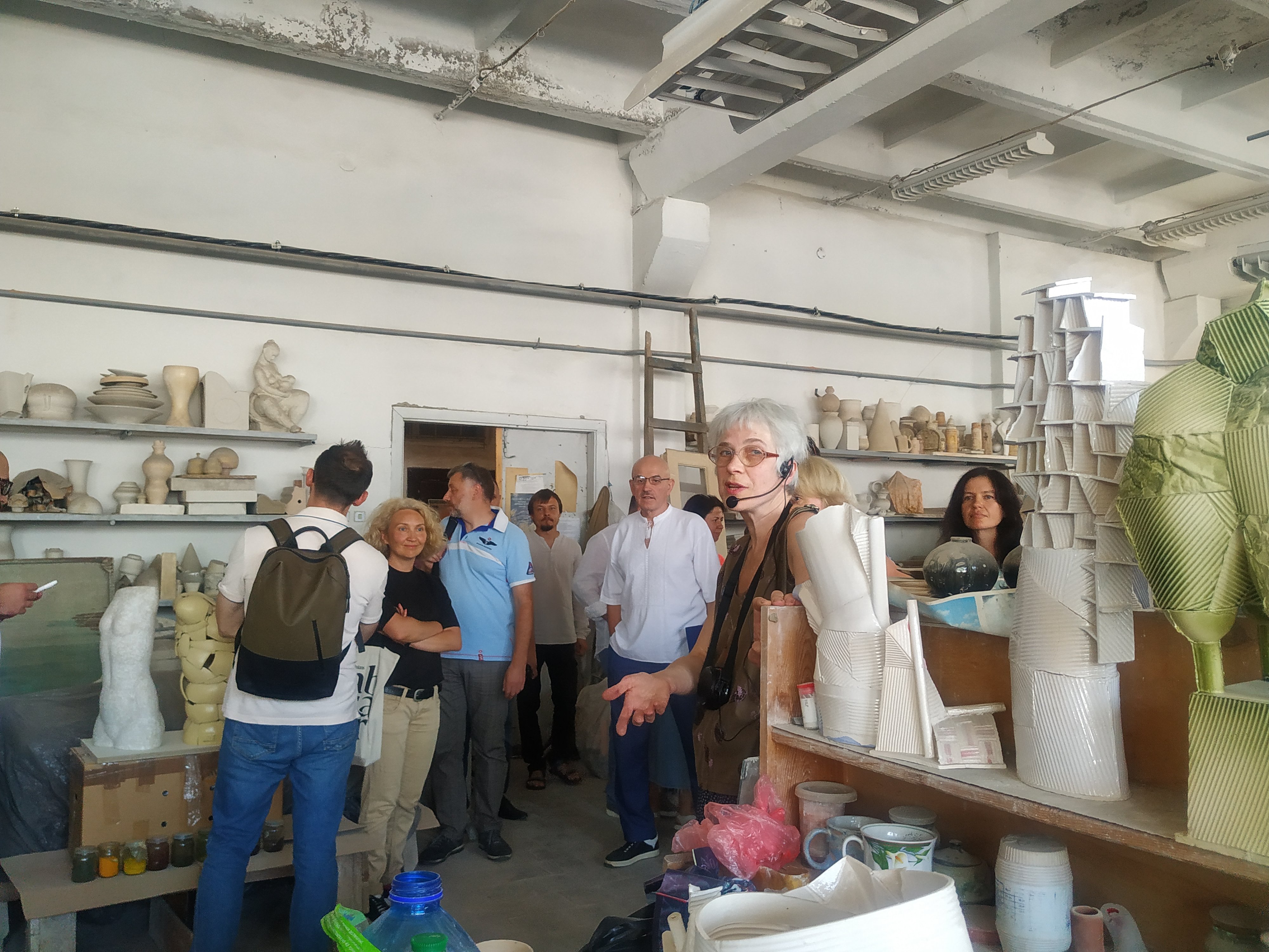 Анна Лисик веде кілька десятків присутніх до творчих майстерень. Приміщення занедбані, у них стоять сотні виробів, де-не-де протікає стеля. Подвір'я навколо майстерень та цехів всипані склом, навколо колишнього фонтана лежить сміття. У найгіршому стані – склоцех. Відвідувачі намагаються потрапити у кімнати, де стоять печі, але всі двері замкнені. Частина входів заварена. Про те, що тут активно працювали керамісти видно зі стін, які прикрашені фрагментами виробів.