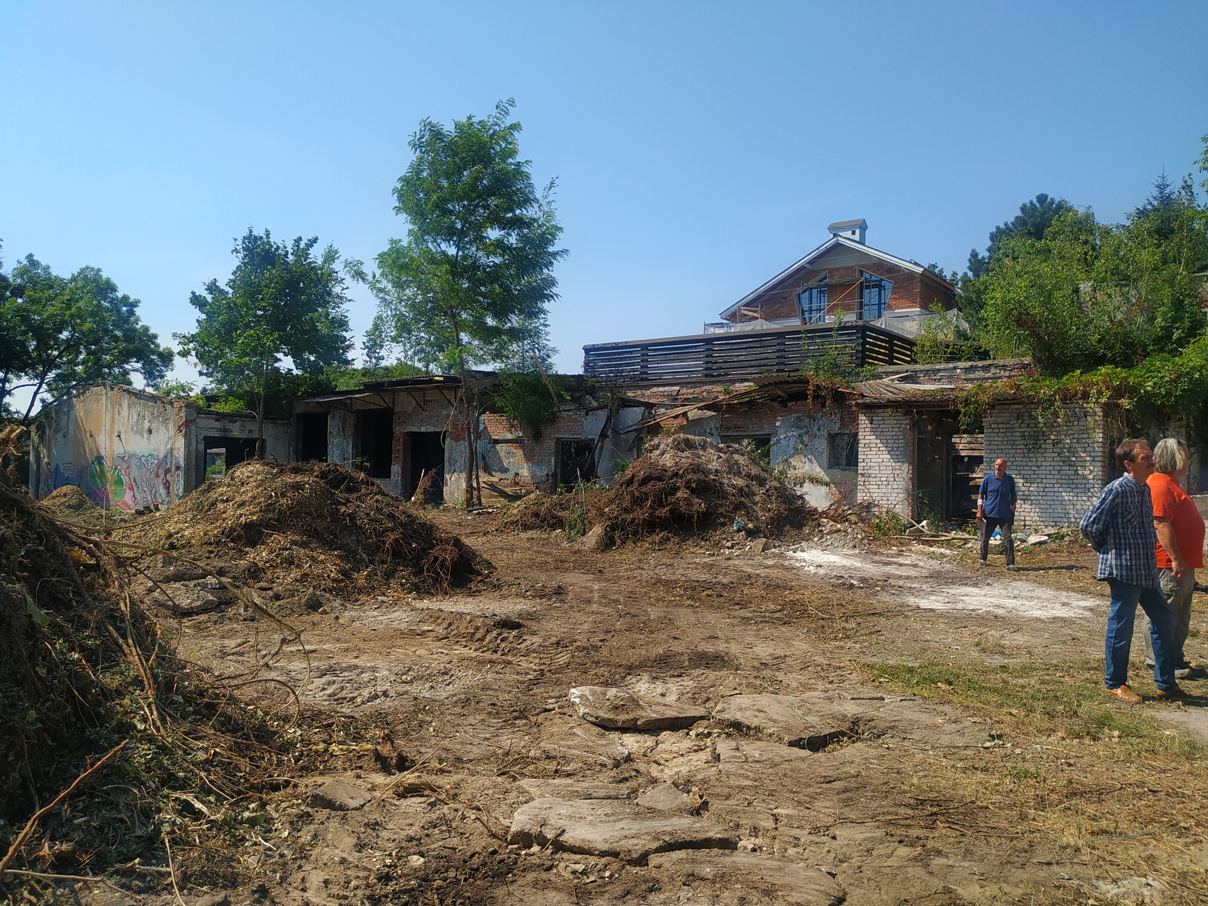 Переміщення між корпусами по території фабрики займає приблизно годину. Все уповільнює спека. Люди розгублено дивляться на те, що залишилося від корпусів. Серед них стоїть Ростислав Оленчин – керівник компанії «Акрополь», яка з 2008 року управляє майном фабрики. Чоловік каже, що раніше «був людиною з мотивацією, але все завершилося у 2021 році, коли спілка художників, яка є власником фабрики, відмовилася реалізовувати проекти».