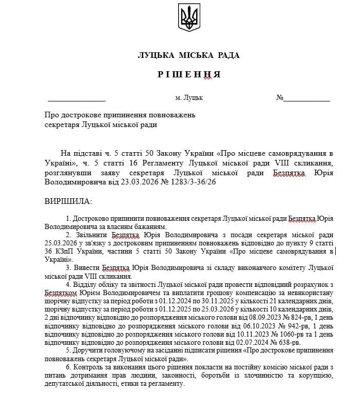 Зазначимо, що у разі складання повноважень міського голови його обов’язки тимчасово виконуватиме секретар міської ради – до проведення нових виборів або ухвалення інших кадрових рішень, відповідно до законодавства.