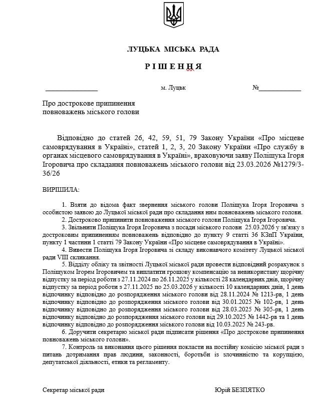 Луцький міський голова Ігор Поліщук написав заяву про складання повноважень. Про це у понеділок, 23 березня, повідомив депутат Луцької міськради від Громадянського руху «Свідомі» Андрій Лучик.