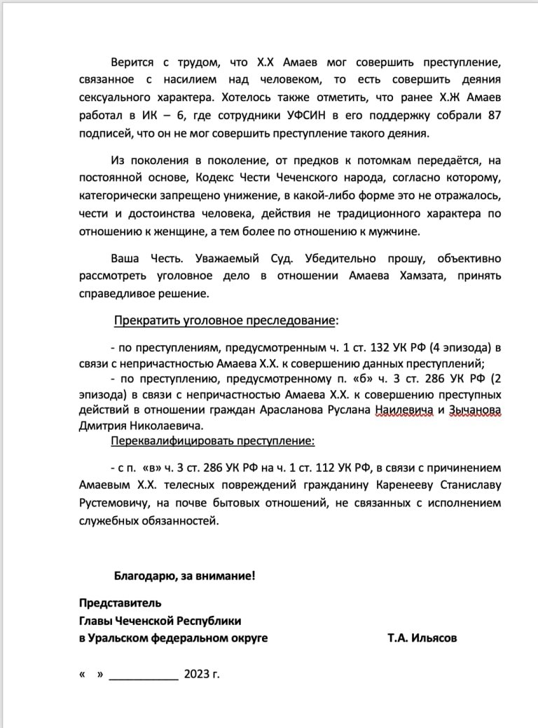 У листах представництва йдеться, що Ільясов неодноразово особисто намагався допомогти уникнути відповідальності громадянам Чечні. Деякі з них звинувачувалися в зґвалтуваннях та нанесеннях тілесних ушкоджень. Для виправдань злочинців Ільянов казав, що вони мають хороші якості та не могли вчинити подібних злочинів.