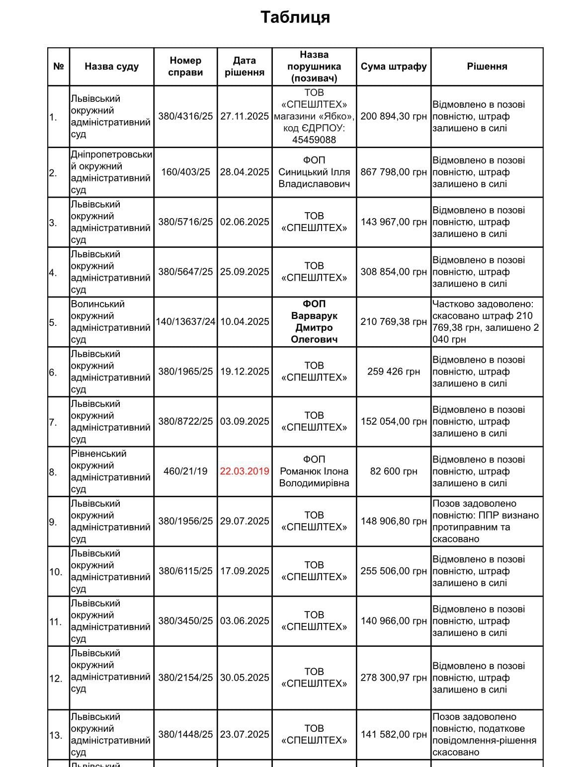 Мережа «Ябко» і підконтрольні їй ФОПи отримали 36 млн грн штрафів