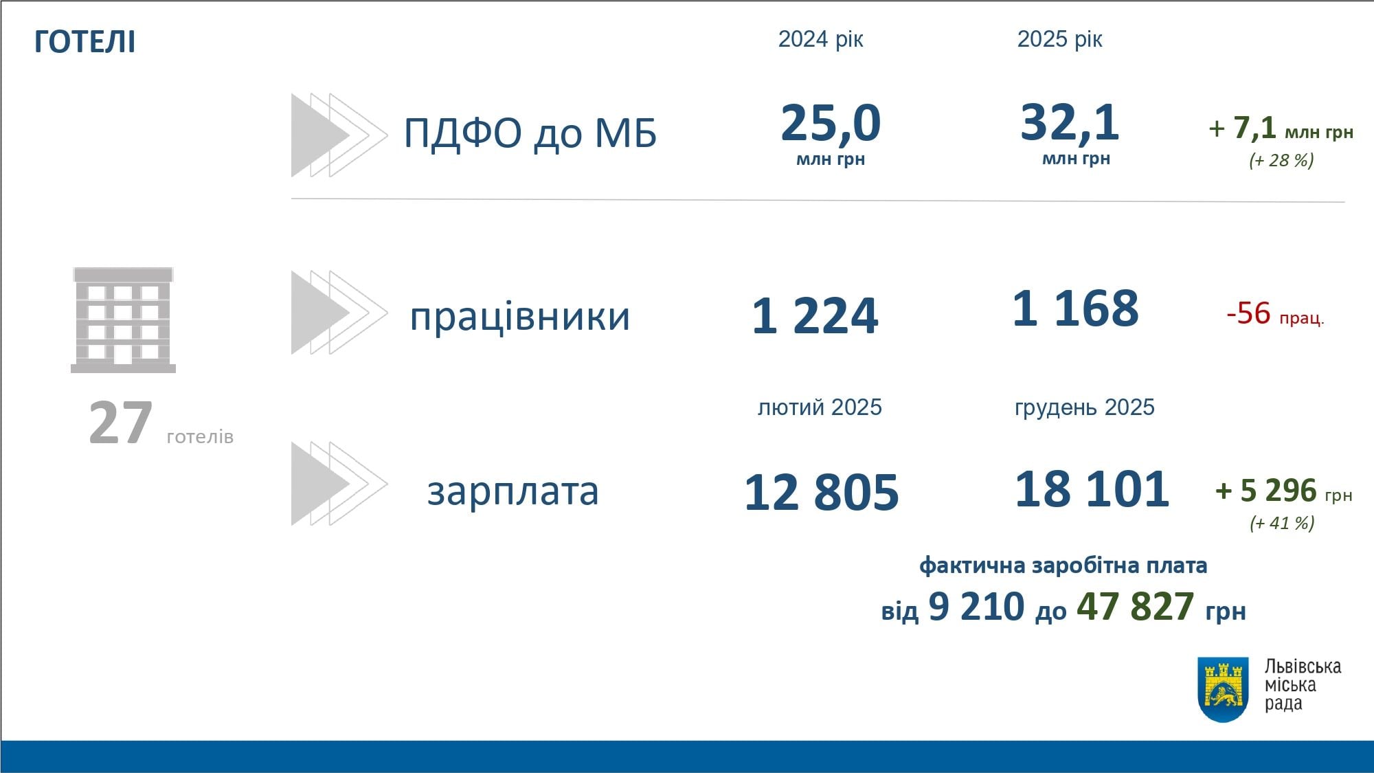 Згідно з аналізом ЛМР, у 2025 році львівські готелі сплатили 32,1 млн грн податків на доходи фізичних осіб (ПДФО), тоді як у 2024 році – 25 млн грн. Середня зарплата в галузі зросла з 12,8 тис. грн на місяць до 18 тис. грн.