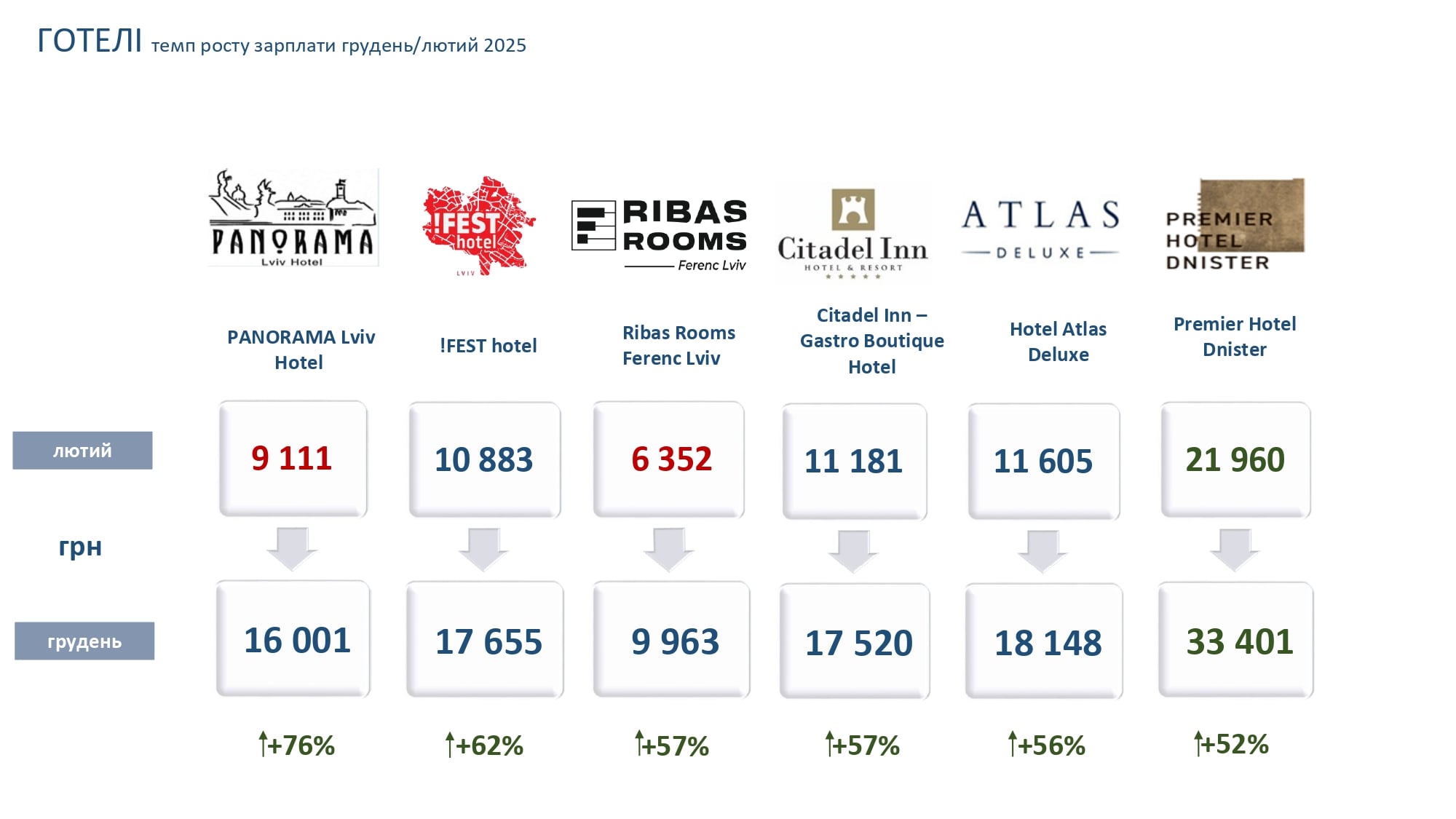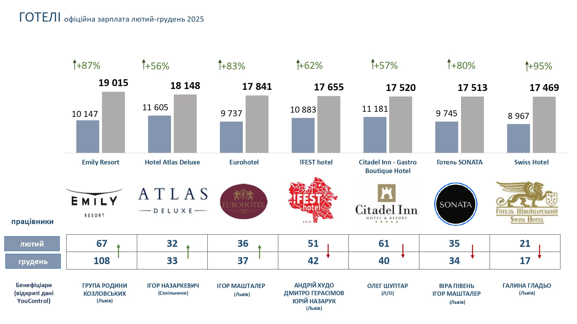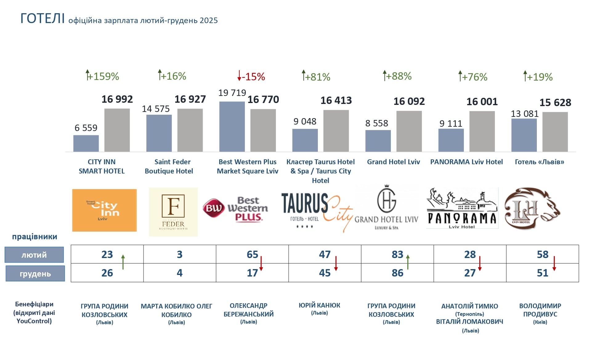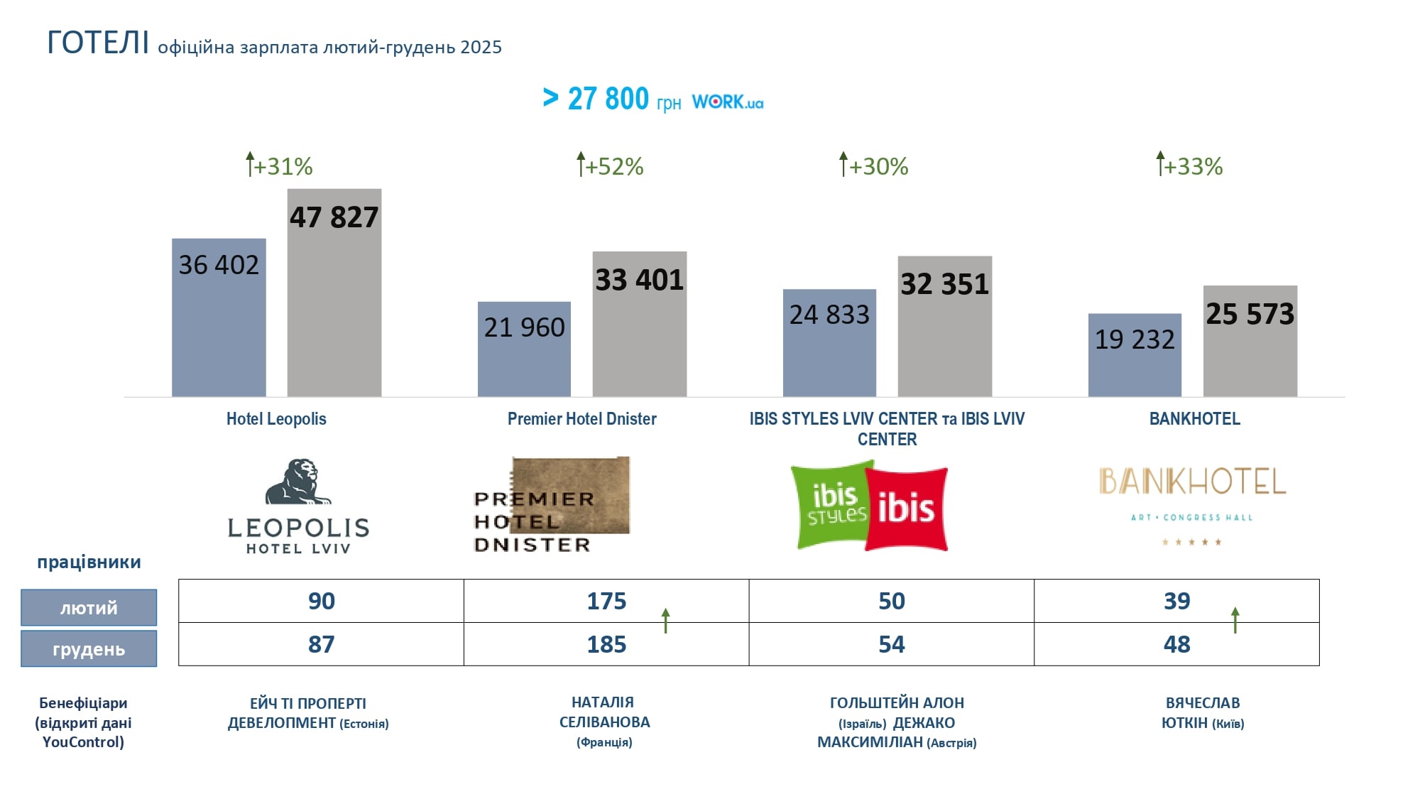 Натомість у двох проаналізованих готелях зафіксували зниження рівня середніх зарплат – Nobilis Hotel (з 9,8 тис. грн до 9,5 тис. грн) і Best Western Plus (з 19,7 до 16,7 тис. грн).