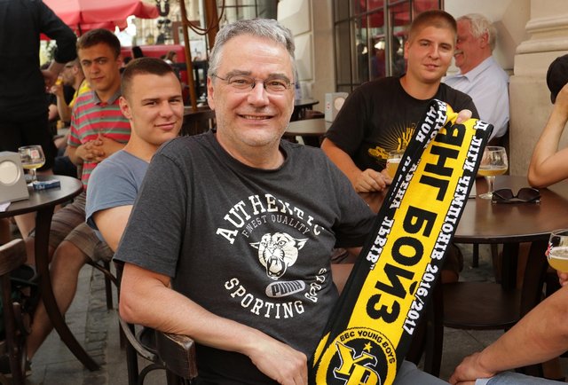 Це переважно чоловіки, які невеликими групами окупували столики в одному із закладів на площі Ринок. Їх можна розпізнати за яскравою символікою клубу «Янг Бойз», виконаною у чорних та жовтих кольорах. «Бджоли» - так називають футболістів та прихильників клубу.