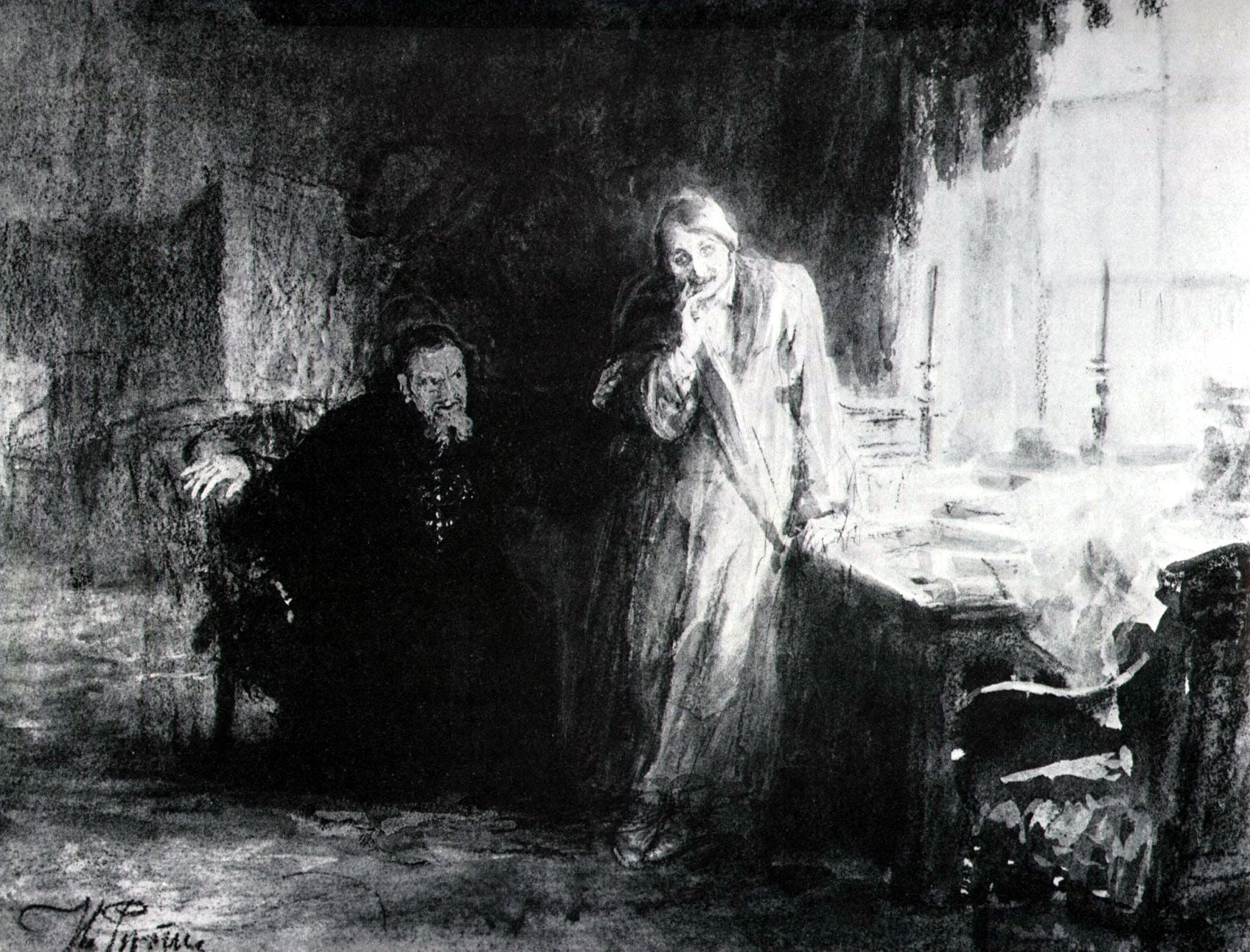 Ілля Ріпин. Микола Гоголь і його духівник о. Константиновський (рисунок 1902 року з Вікіпедії)