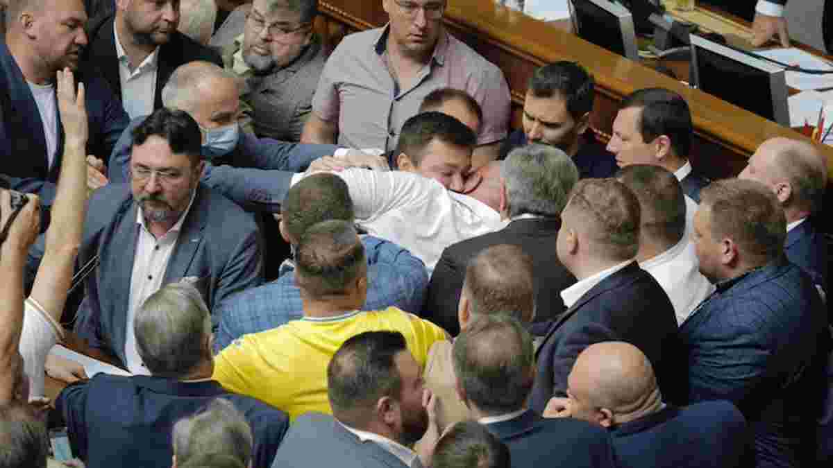 До трибуни одразу підбігли депутати від ОПЗЖ та «Слуги народу». Між ними почалася словесна перепалка, а після – штовханина.