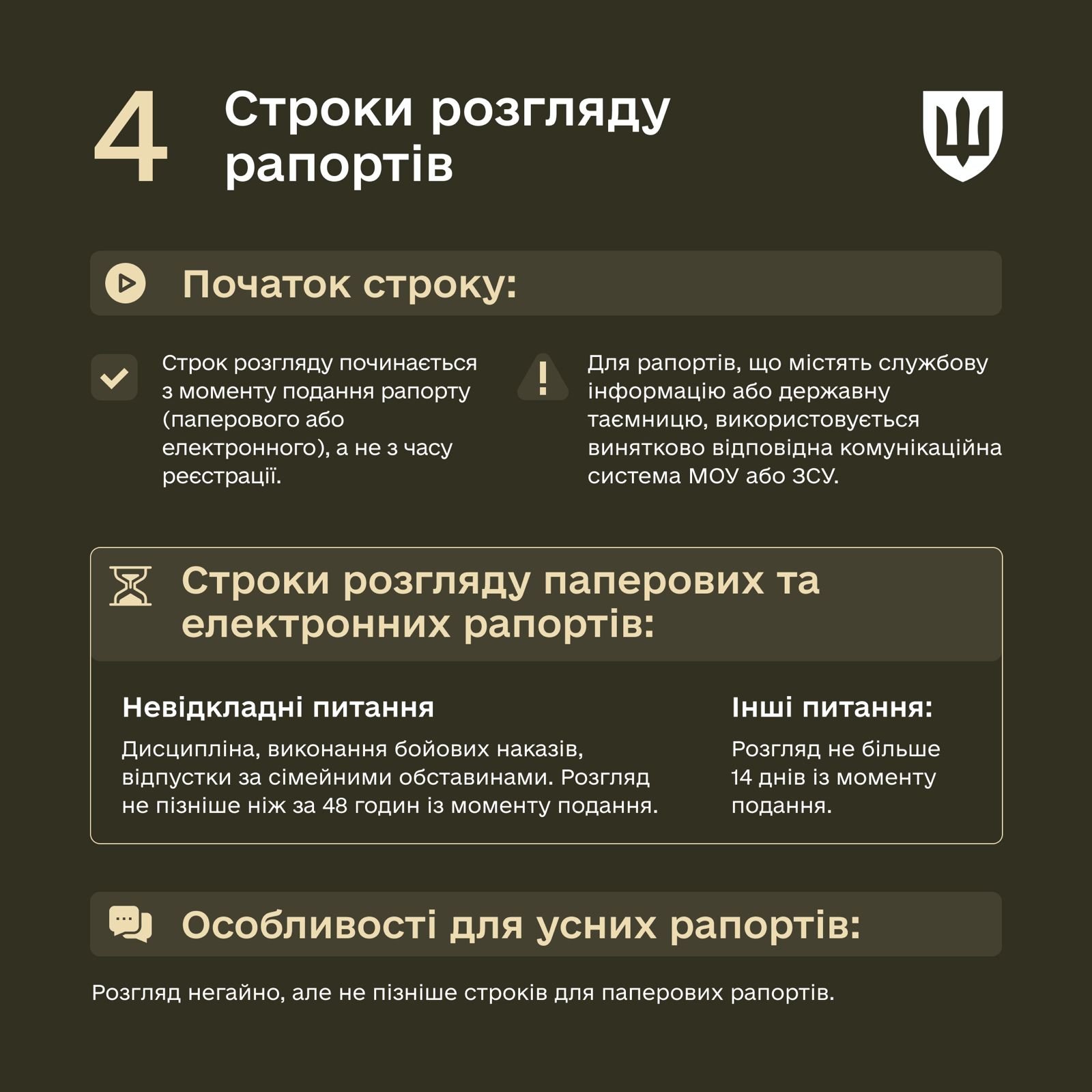 - гарантовано розгляд рапортів щодо військової дисципліни, бойових завдань, здоров’я особового складу та відпусток не пізніше як протягом 48 годин після подання;