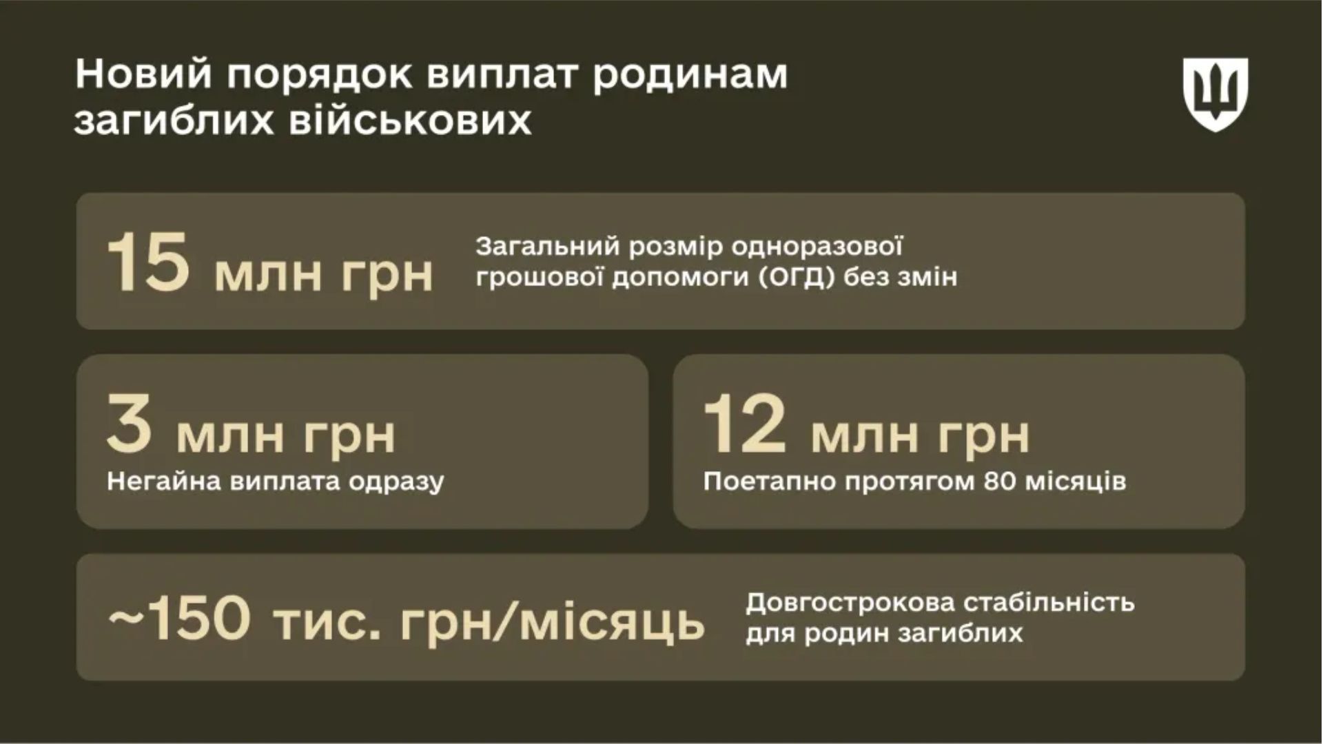 - родина загиблого отримує 3 млн грн (1/5 від усієї суми) негайно