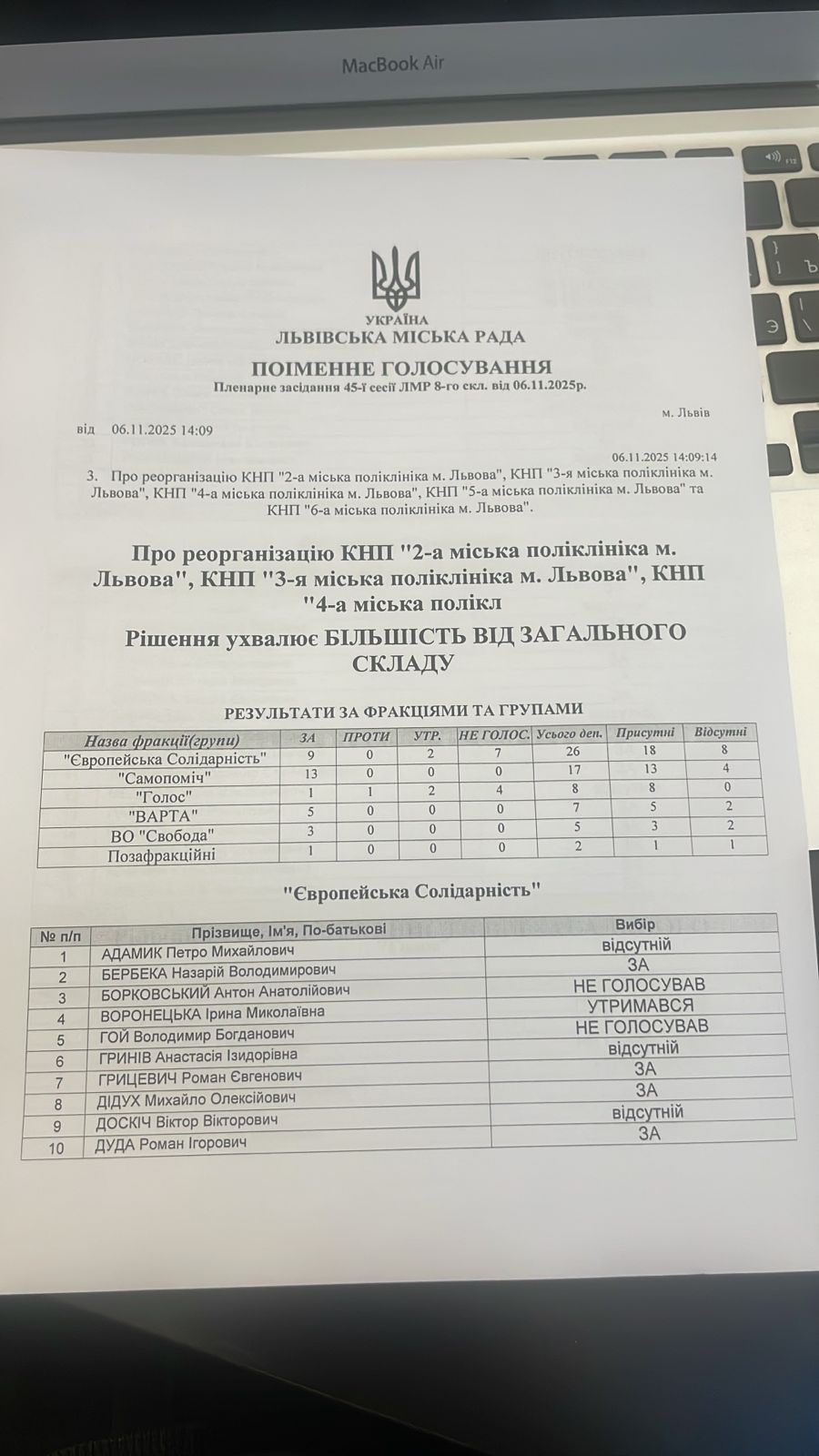 Поіменне голосування за реорганізацію п’яти поліклінік у Львові