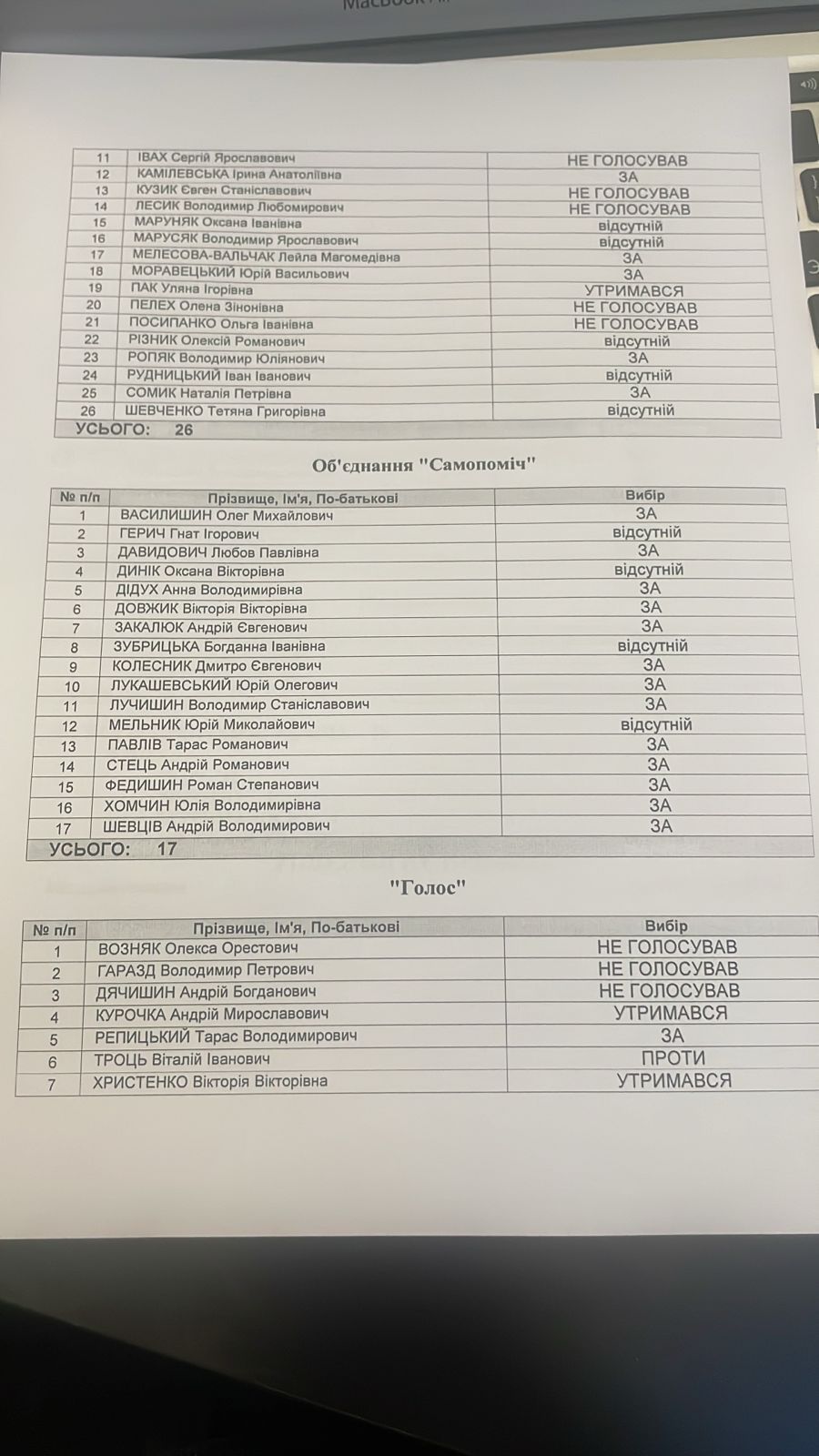 Втім на засіданні 6 листопада депутатам не вистачило одного голосу для підтримки цього питання. За проголосували 32 депутати, проти – Віталій Троць, не голосували – Марія Чижишин, Ольга Посипанко, Олена Пелех, Євген Кузик, Володимир Лесик, Володимир Гаразд, Володимир Гой, Андрій Дячишин, Сергій Івах, Антін Борковський та Олекса Возняк. Утримались – Ірина Воронецька, Андрій Курочка, Уляна Пак та Вікторія Христенко.