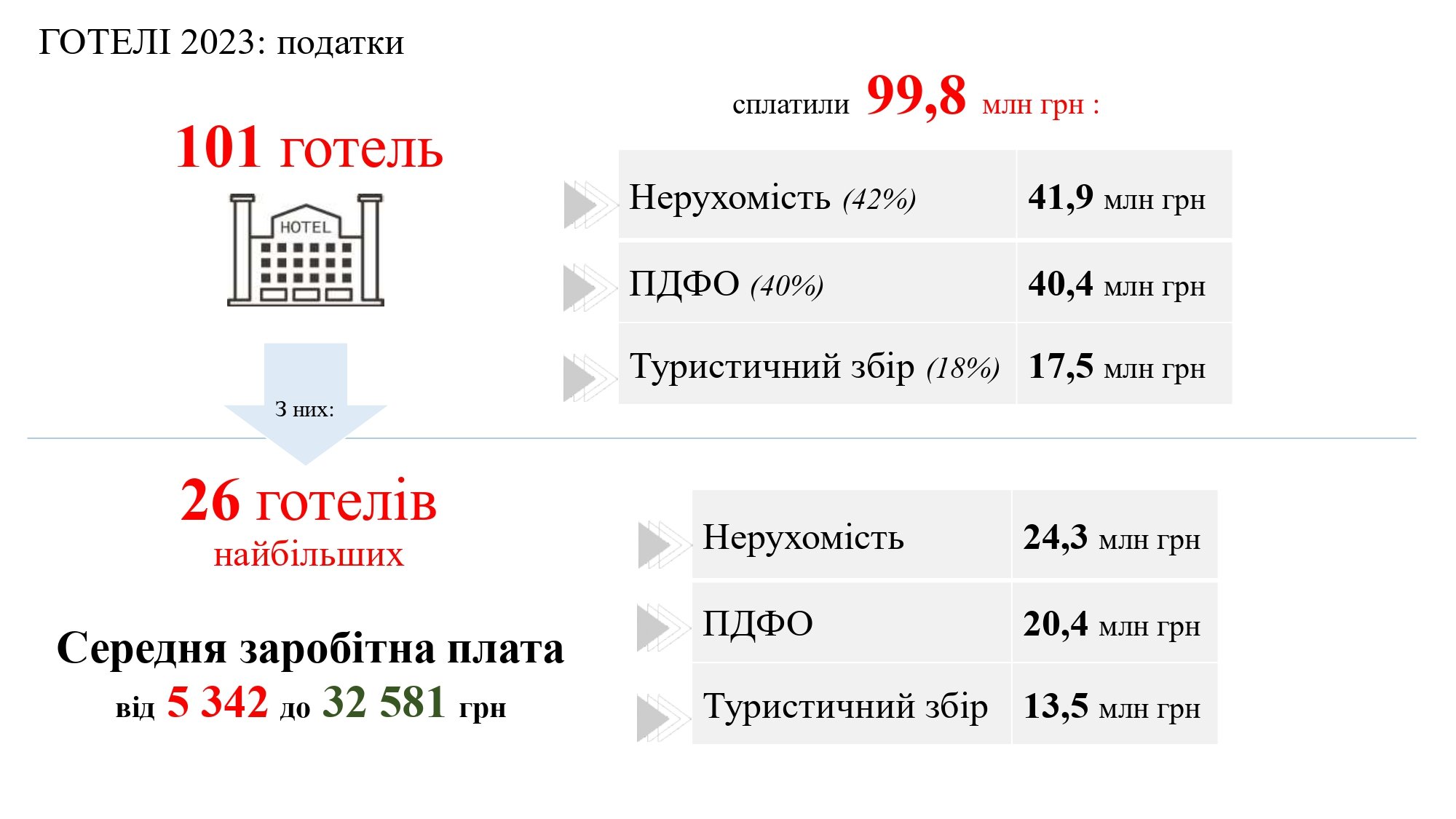 Загалом ЛМР проаналізувала діяльність 101 готелю, що функціонує на території Львівської громади. За 2023 рік вони сплатили 99,8 млн грн податків, серед яких 41,9 млн грн – це податок на нерухомість, 40,4 млн грн – це ПДФО та 17,5 млн грн туристичного збору. Водночас мерія не назвала, які саме готелі сплатили найбільше податків.