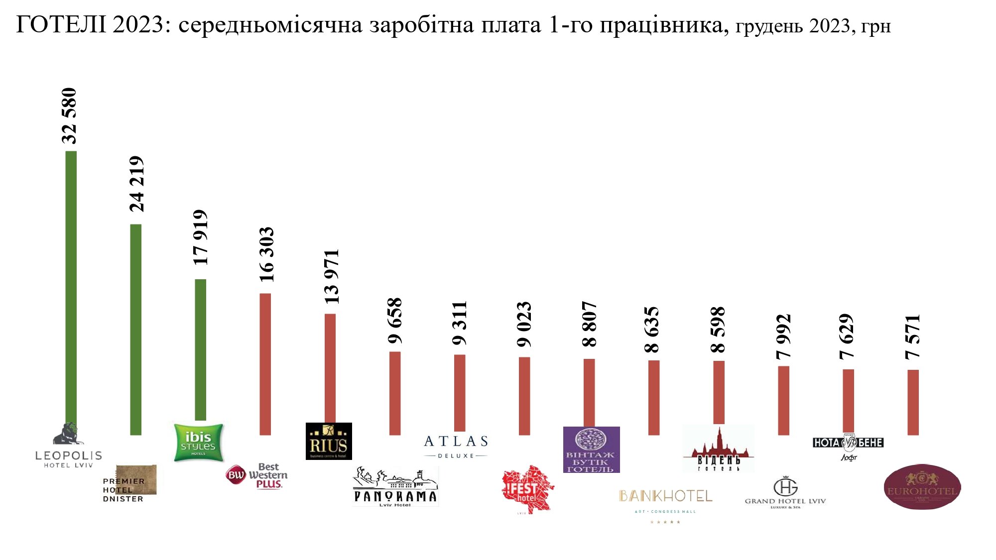 Також міськрада оприлюднила середні зарплати у найбільших львівських готелях. Саме від цих сум до міського бюджету сплачується податок на доходи від фізичних осіб (ПДФО). Середня зарплата в готелях коливається від 5,3 тис. грн на місяць до понад 32 тис. грн на місяць. Найвищі зарплати у готелях:
