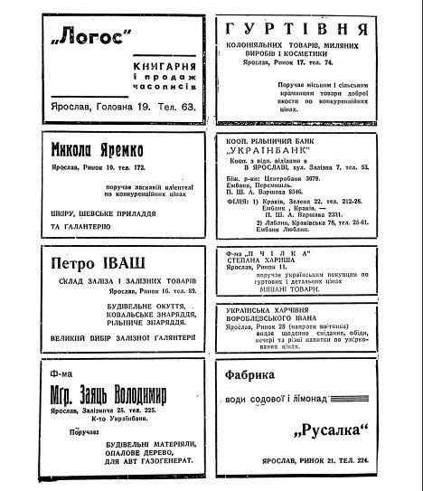 У 1940-1944 роках в Ярославі працювала державна українська гімназія, в якій в останній навчальний рік було 485 учнів. У воєнні роки українці Ярослава відкрили кооперативний банк, книгарню «Логос», друкарню «Альфа», фабрику содової води «Русалка», фірму будівельних матеріалів Володимира Зайця, крамницю «Пчілка».