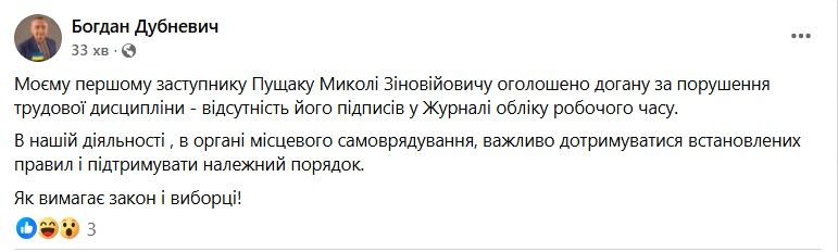 «Моєму першому заступнику Пущаку Миколі Зіновійовичу оголошено догану за порушення трудової дисципліни – відсутність його підписів у журналі обліку робочого часу», – повідомив голова Солонківської сільради Богдан Дубневич 12 серпня у фейсбуці.