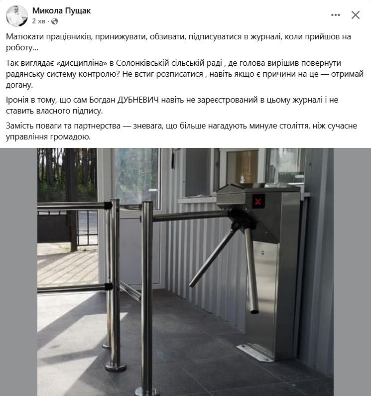 У той час перший заступник Микола Пущак публічно обурився методами дисципліни та контролю, запровадженими у Солонківській сільраді. Щоправда, менше ніж за пів години він свій допис, який був проілюстрований механічним турнікетом-вертушкою, видалив.