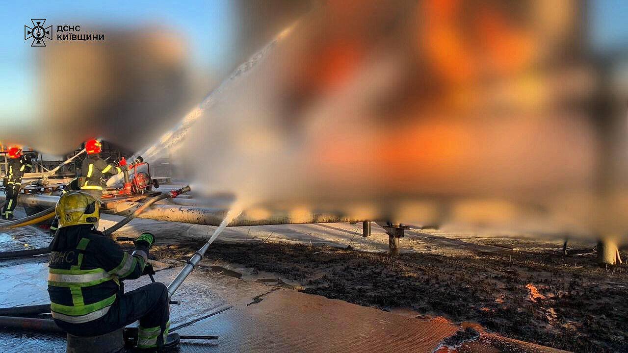 На Київщині понад добу гасять пожежу на промисловому обʼєкті після атаки росіян