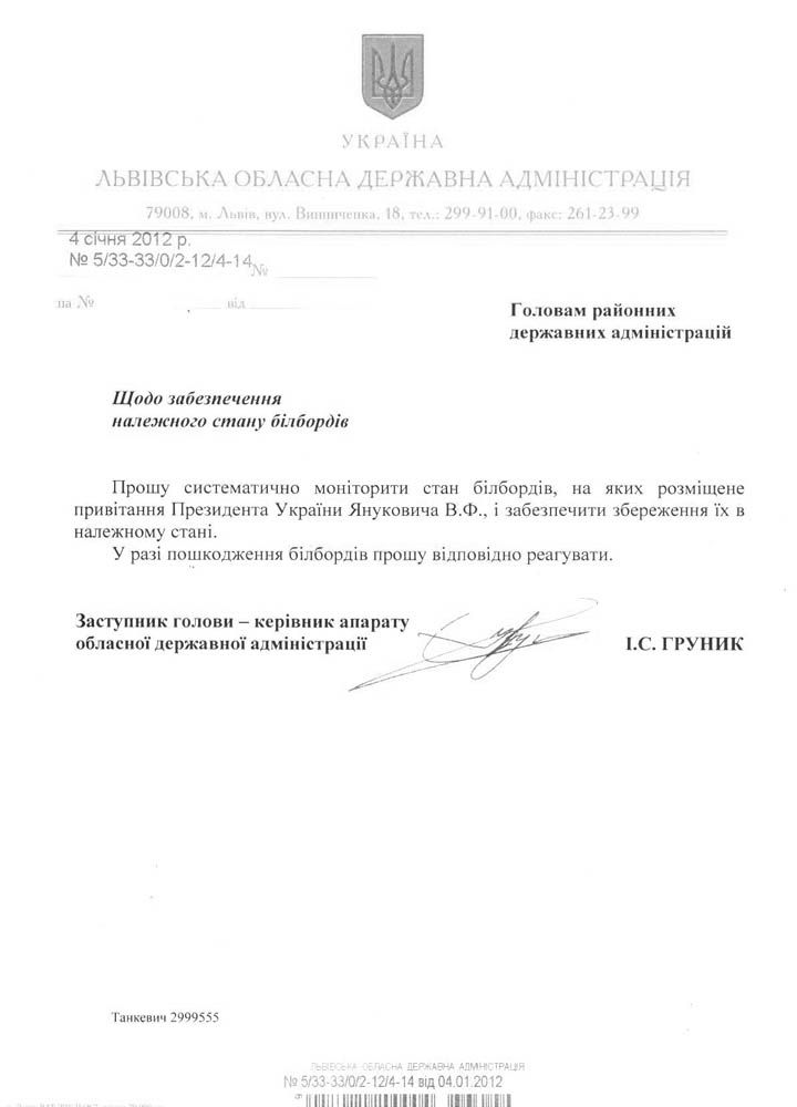 Львівська облдержадміністрація розіслала розпорядження, відповідно до якого, на голів районних державних адміністрацій покладається відповідальність за стан білбордів, на яких зображений Президент України Віктор Янукович.