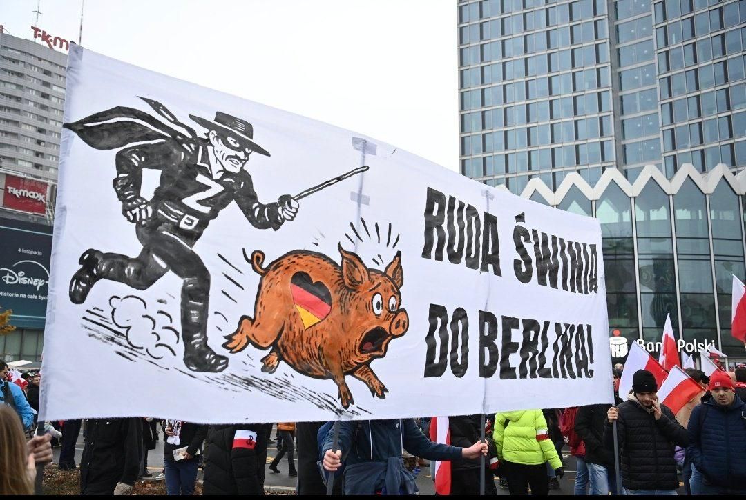 На Марші Незаледності також помітили символ російської агресії – латинську літеру Z. Активісти зобразили цей символ на грудях у людини, яка виганяє свиню з прапором Німеччини на боці з Польщі до Берліна. Свинею на картинці зобразили чинного прем’єр-міністра Дональда Туска, якому закидають пронімецькі настрої.