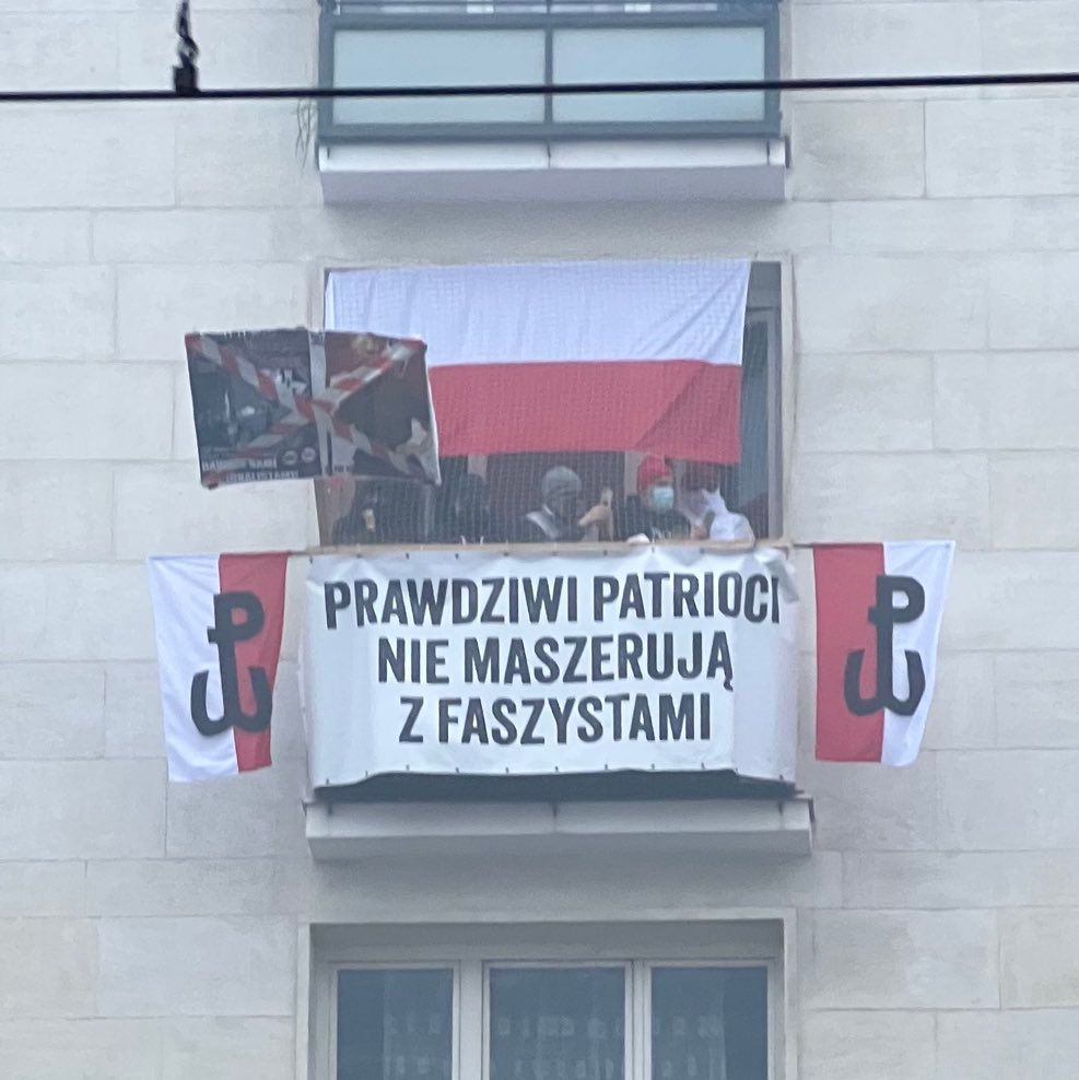 Разом з тим на одній з будівлі помітили плакат із написом «Справжні патріоти не марширують разом із фашистами».