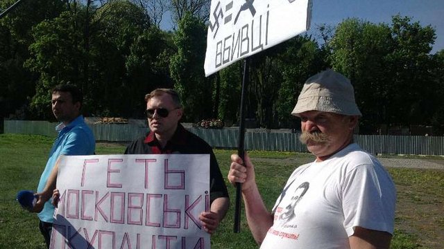 Представники Української республіканської партії "Собор" Григорій Ангел та Ярослав Климовський принесли на Марсове поле у Львові плакати "Геть московські окупанти!" та "Геть вбивці".