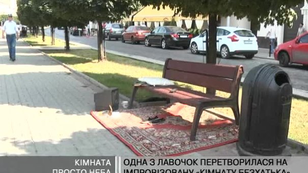 На алеї, що на проспекті Шевченка, оселився безхатченко. Одну із лавочок невідомий використав як диван у своїй імпровізованій кімнаті, поруч поклав килим, розмістив на ньому домашні капці, журнали та телевізор.