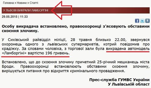 Вчора ввечері охоронець львівського супермаркету «Арсен» на Сихові затримав 25-річного мешканця міста Броди, який вкрав з прилавка модель автомобіля Lamborghini. Прикметно, що прес-служба міліції Львівщини опублікувала повідомлення про цей випадок під гучним заголовком «У Львові вкрали Ламборгіні».