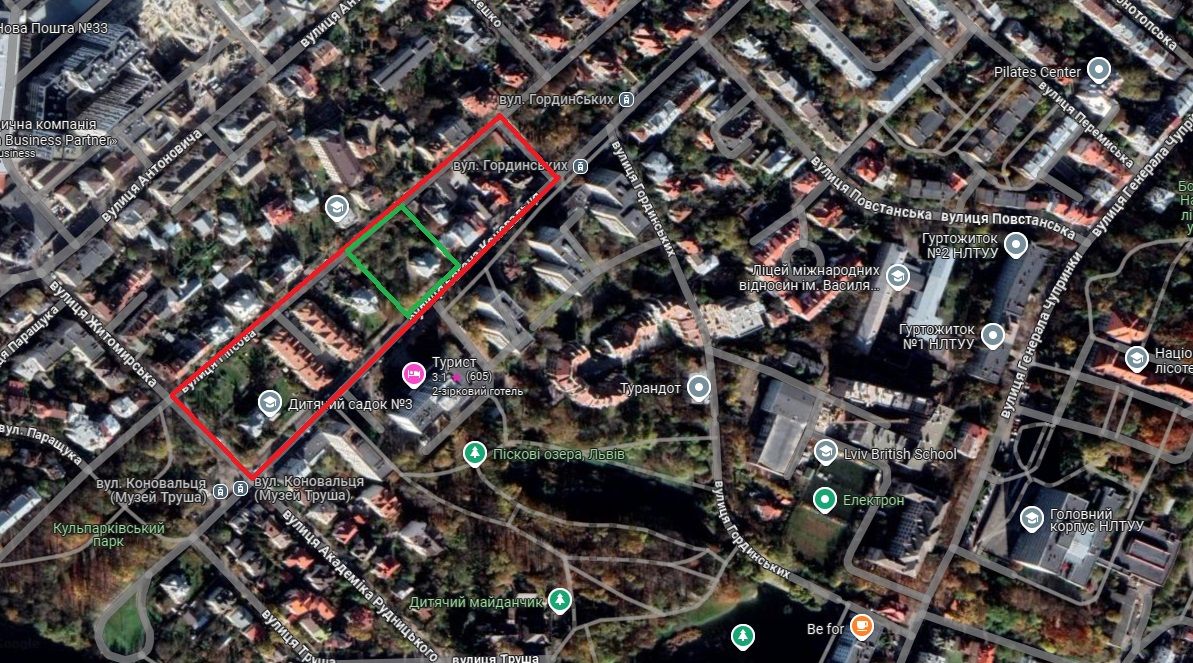 Червоним кольором позначена територія ДПТ, зеленим – ділянка, де планують збудувати ЖК