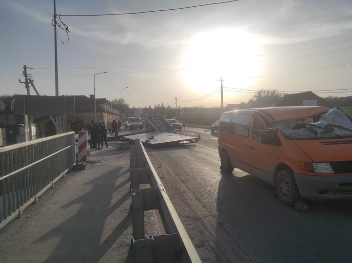 Через пориви сильного вітру на в’їзді в Бережани сталася аварія. Великий рекламний щит впав на автомобіль Mercedes Benz, який проїжджав повз. Про цю ситуацію повідомив місцевий житель Володимир Березін в Facebook. Від удару в транспорті розтрощило лобове скло, травми отримав водій, розповіли ZAXID.NET в поліції Тернопільщини. Медики швидкої допомоги доправили його в місцеву лікарню.
