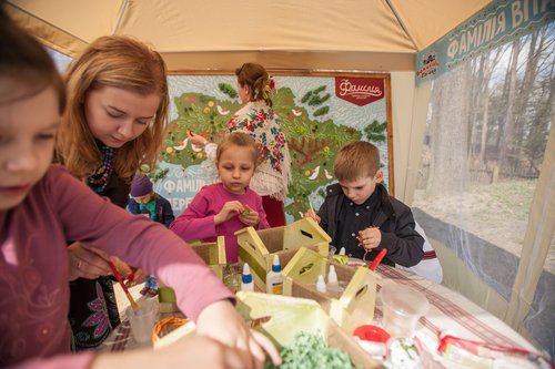 Більш посидючим та творчим гостям запропонували виготовити панно “Фамільне дерево”. За основу взяли ідею про одну велику родину – Україну, і на карті країни розміром з 2 на 3 метри задекорувати різні деталі. Кожен охочий вкладав свою фантазію і своє бачення фамільного дерева.