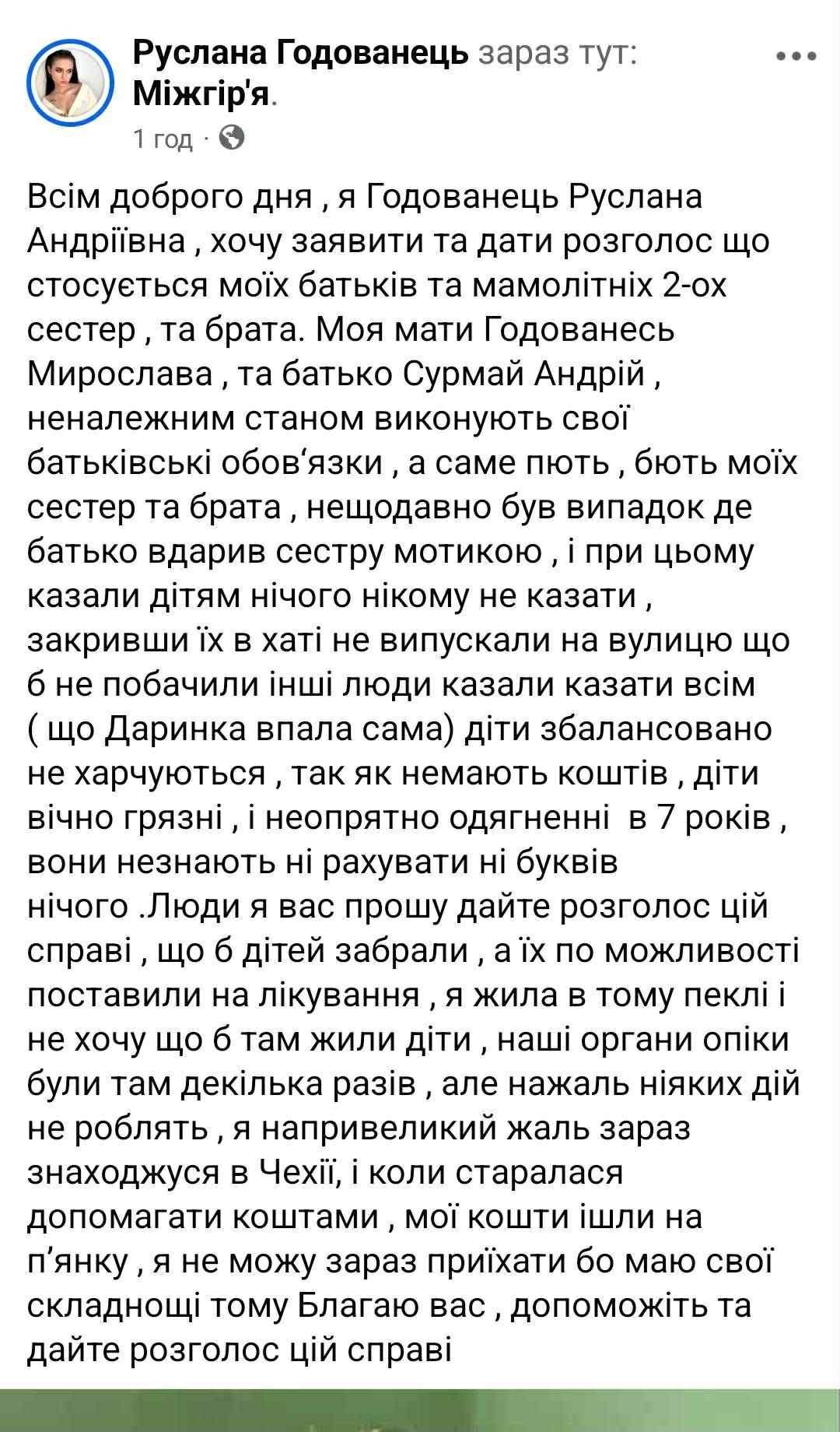 Про насильство над своїми сестрами та братом у фейсбуці написала Руслана Годованець, яка працює в Чехії та допомагає родині, що залишилася на Закарпатті. За словами дівчини, її батьки часто вживають алкоголь та б’ють дітей.