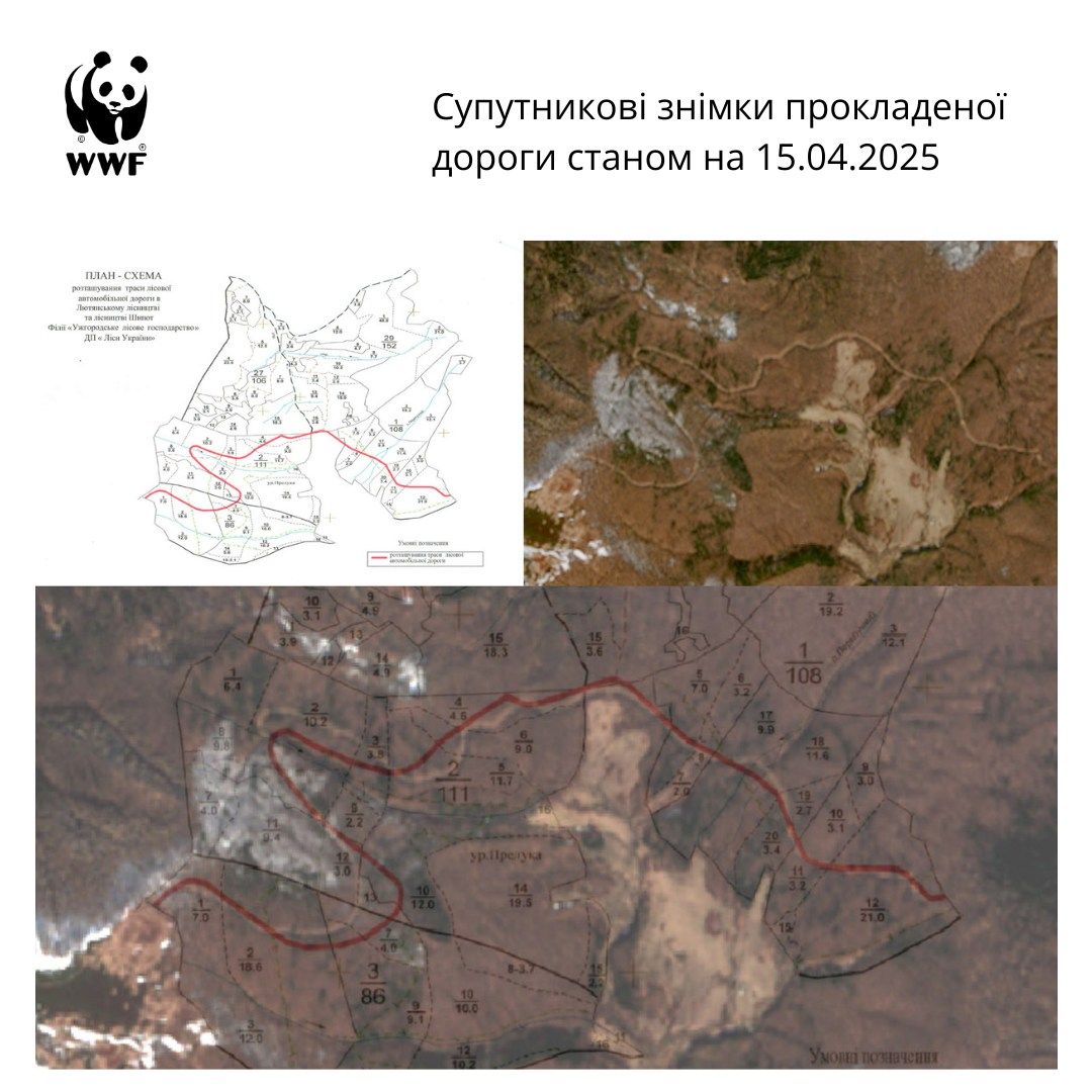 «Станом на 15 квітня супутникові знімки підтверджують факт прокладеної дороги через усі виділи та квартали, вказані в тендері. Зокрема й у виділах 1-2 кварталу 3 лісництва “Шипот” – це територія пралісу та його буферна зона. У реєстрі ці рубки досі позначені як “не розпочаті”, хоча насправді роботи вже завершені», – зауважили у WWF-України.