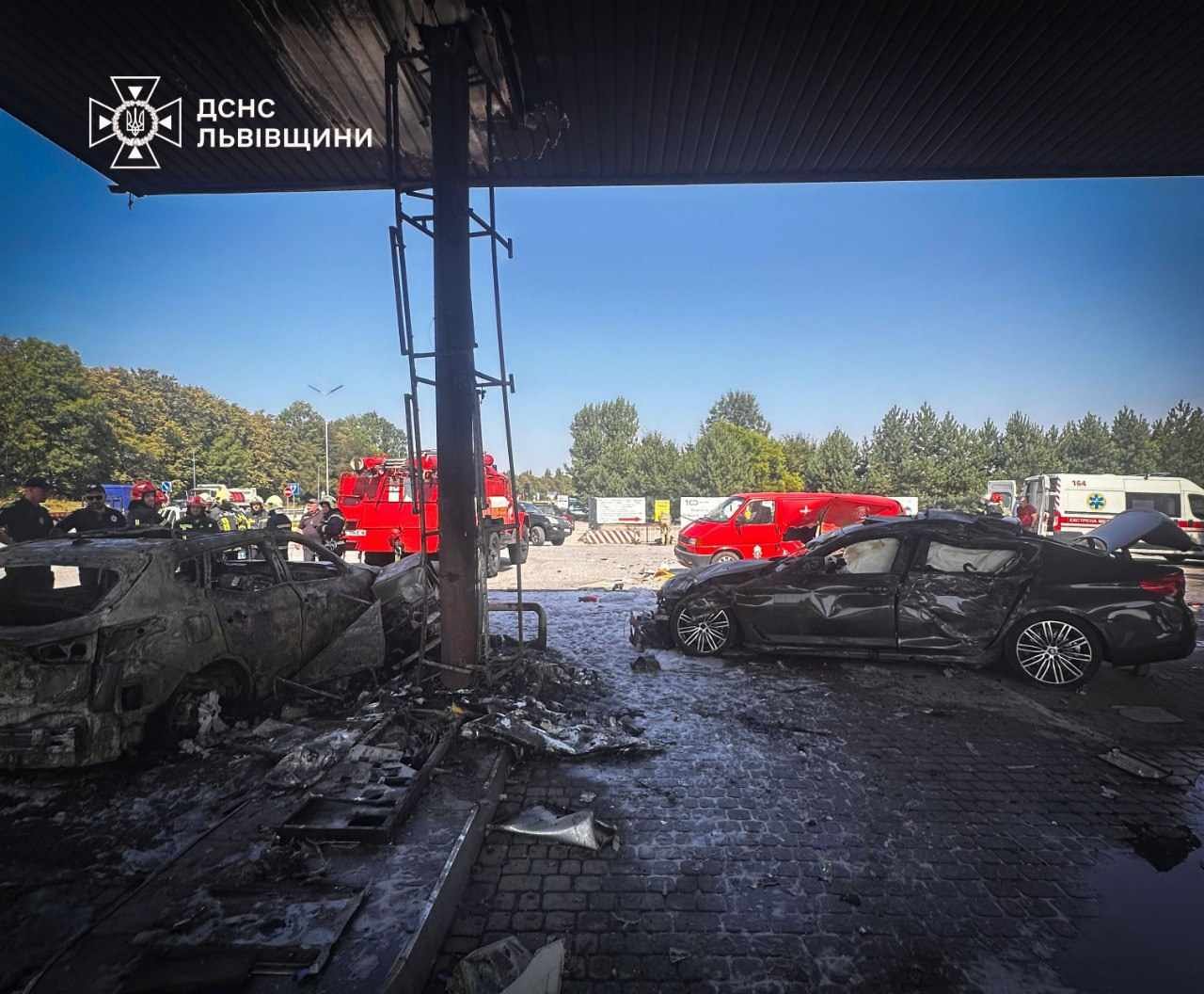 Внаслідок зіткнення бензоколонка зайнялась і вогонь перекинувся на Nissan, у салоні якого, на щастя, нікого не було. Водії BMW та Volkswagen Transporter, 24-річний житель Львова доставлені до лікарні, медики уточнюють їх діагнози.