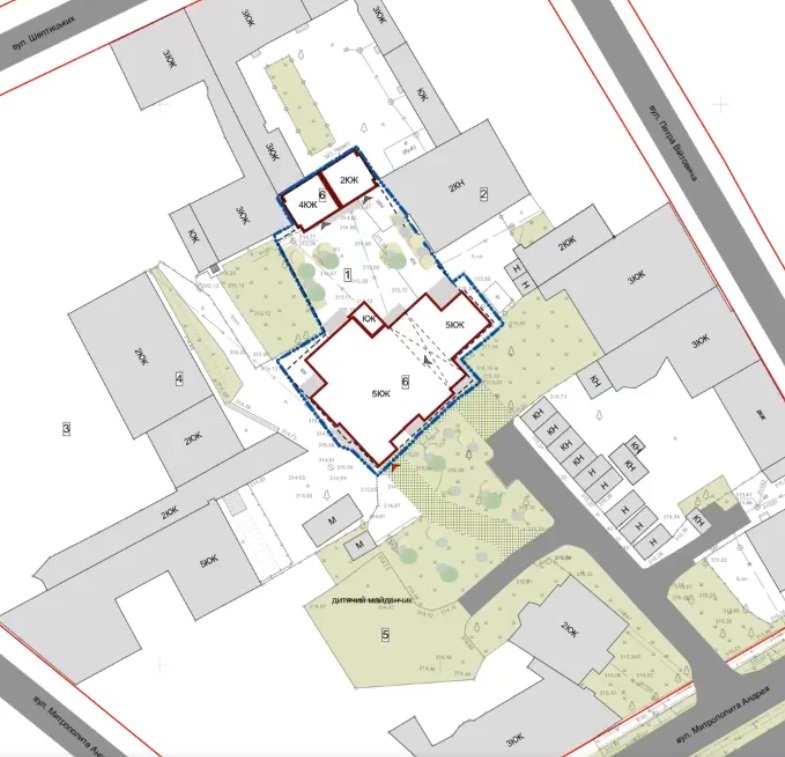 Йдеться про забудову ділянки площею 0,13 га на вул. Шептицьких, 31, вул. Митрополита Андрея, 12, вул. Митрополита Андрея, 12а, що перебуває в комунальній власності. У липні 2024 року депутати ЛМР передали цю ділянку в оренду на 10 років для Ірини Петрицької та ТзОВ «Благо-Ш» під забудову.
