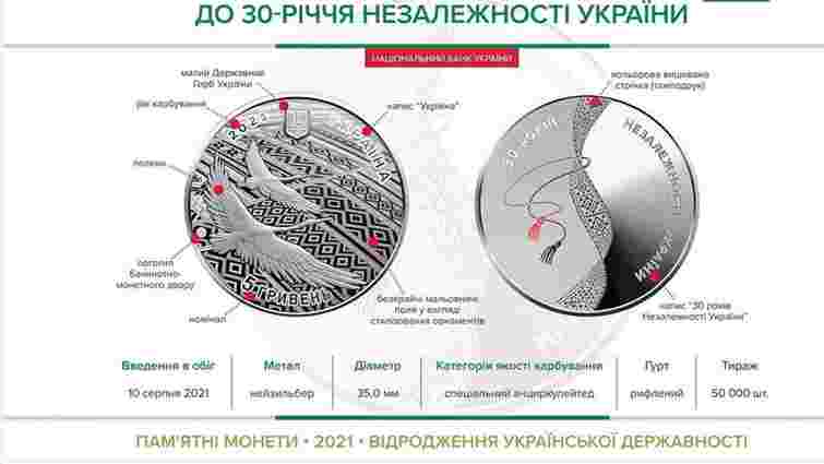 Національний банк України 10 серпня вводить в обіг пам’ятну монету, присвячену 30-річчю Незалежності України. В обіг надійде 35 тис. монет номіналом у 5 грн, виготовлених із нейзильберу.