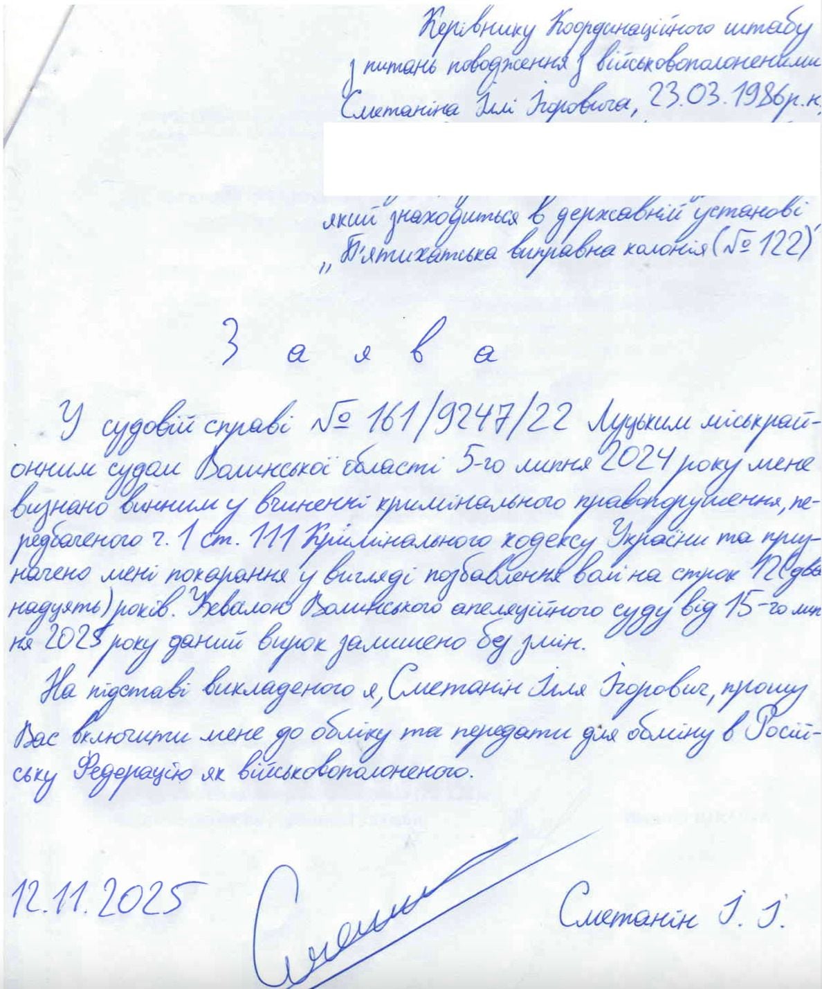 Через чотири місяці після оголошення вироку, у листопаді 2025 року, Ілля Сметанін написав листа до Координаційного штабу з питань поводження з військовополоненими з проханням передати його до Росії як військовополоненого.
