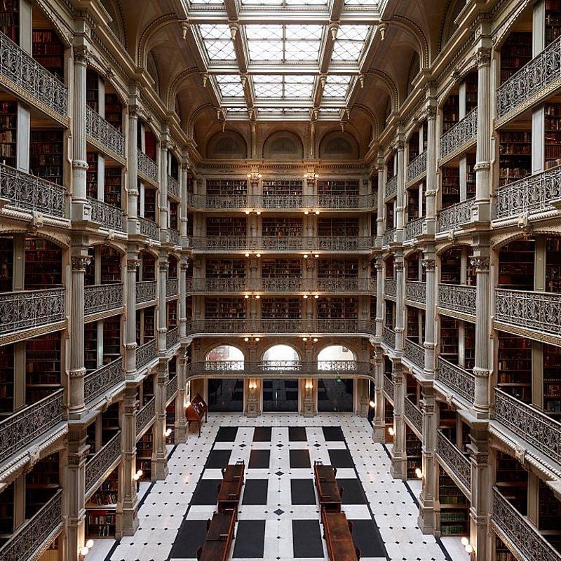З її неймовірною чорно-білою мармуровою підлогою, декоративними чавунними балконами та величезним світловим куполом, не дивно, що бібліотеку Джорджа Пібоді називають «собором книг».